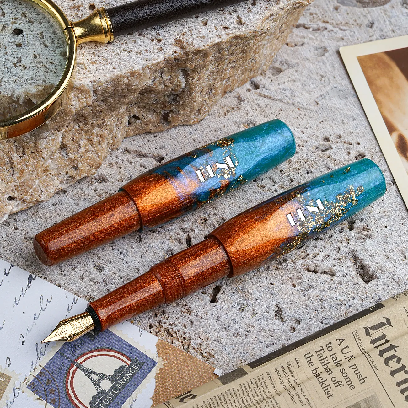 Aurora Gold boasts an exquisite blend of deep turquoise and rich bronze hues, interspersed with flecks of gold glitter. It offers a captivating and elegant aesthetic, perfect for those who appreciate a pen that stands out in both color and design.