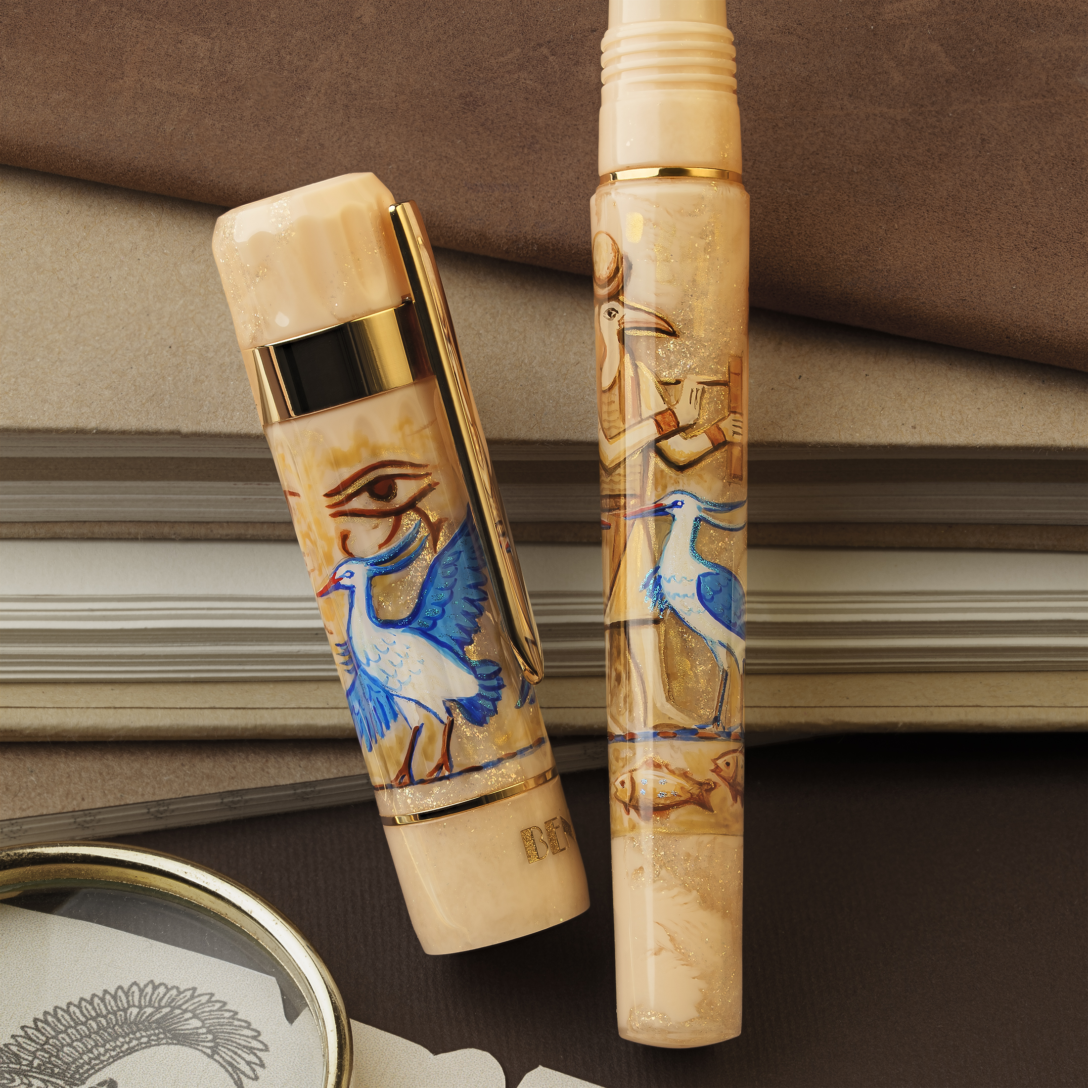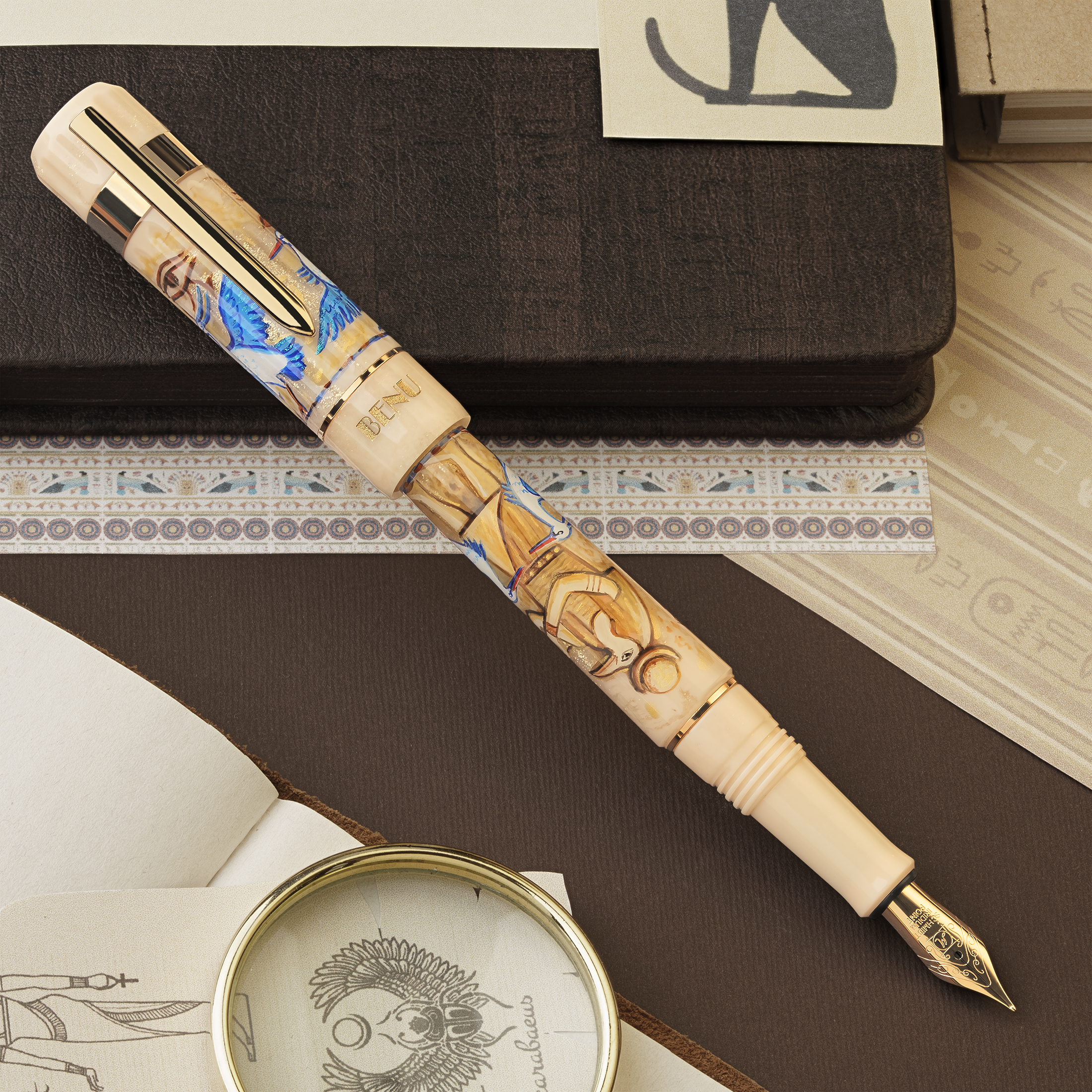 Set against a warm sandy beige base, the pen features a hand-painted depiction of the Bennu bird, surrounded by intricate Egyptian motifs. Each detail is meticulously crafted to capture the beauty and symbolism of this ancient legend.