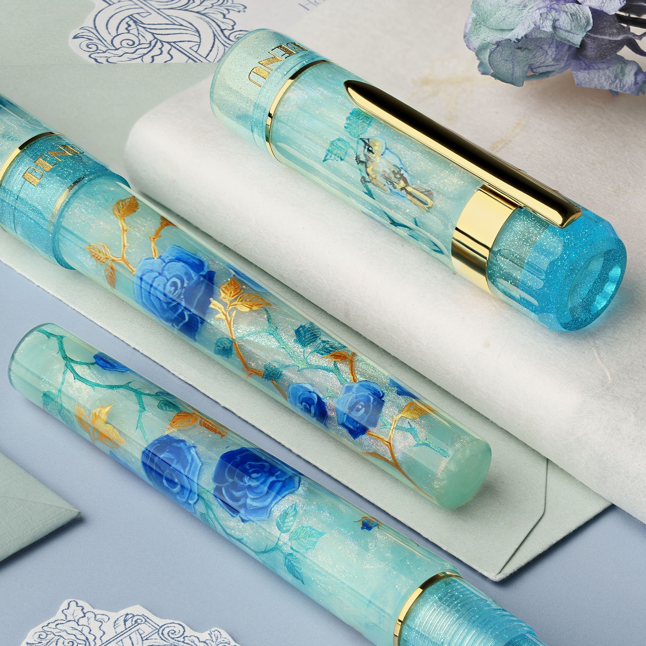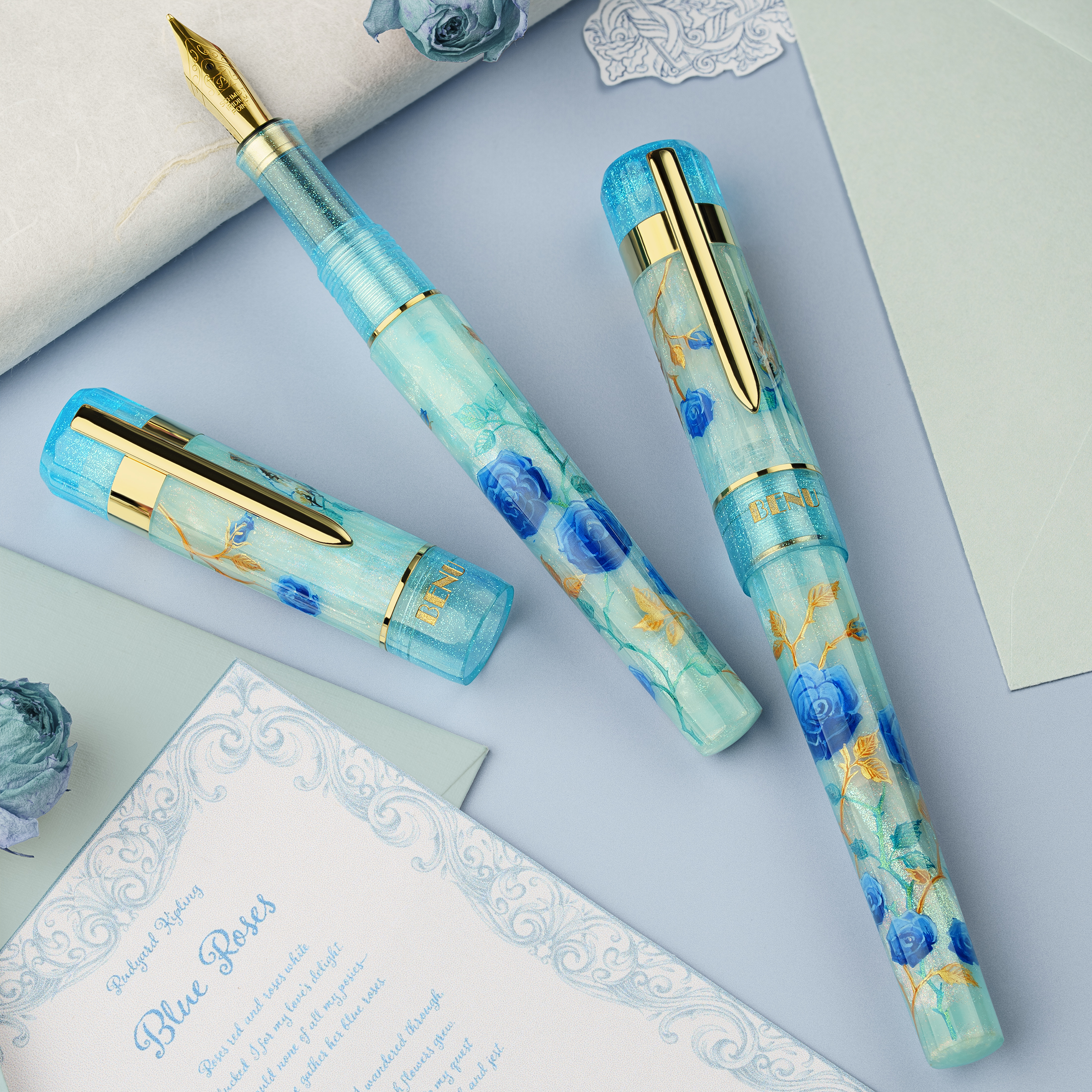 Blue Roses pen captures the essence of this story — its quiet wisdom and tender reflection. Made from BENU’s new Prismatic resin, it glows with a soft shifting light, echoing the dreamlike allure of the poem’s fabled flower. Each pen is hand-painted with blue roses and golden leaves, while a small bird rests among the petals, symbolizing love’s enduring hope and the peace found in what is real. A tribute to Kipling’s Blue Roses — to the dreamers, the seekers, and to every heart that learns beauty was near all along. Available exclusively at BENU Store.