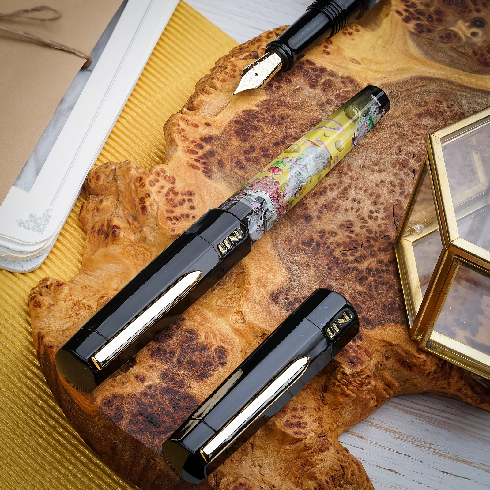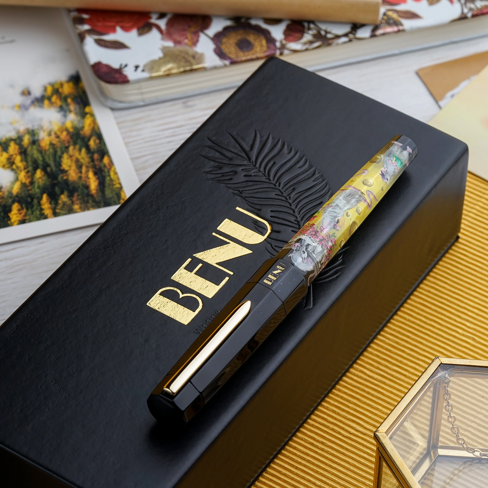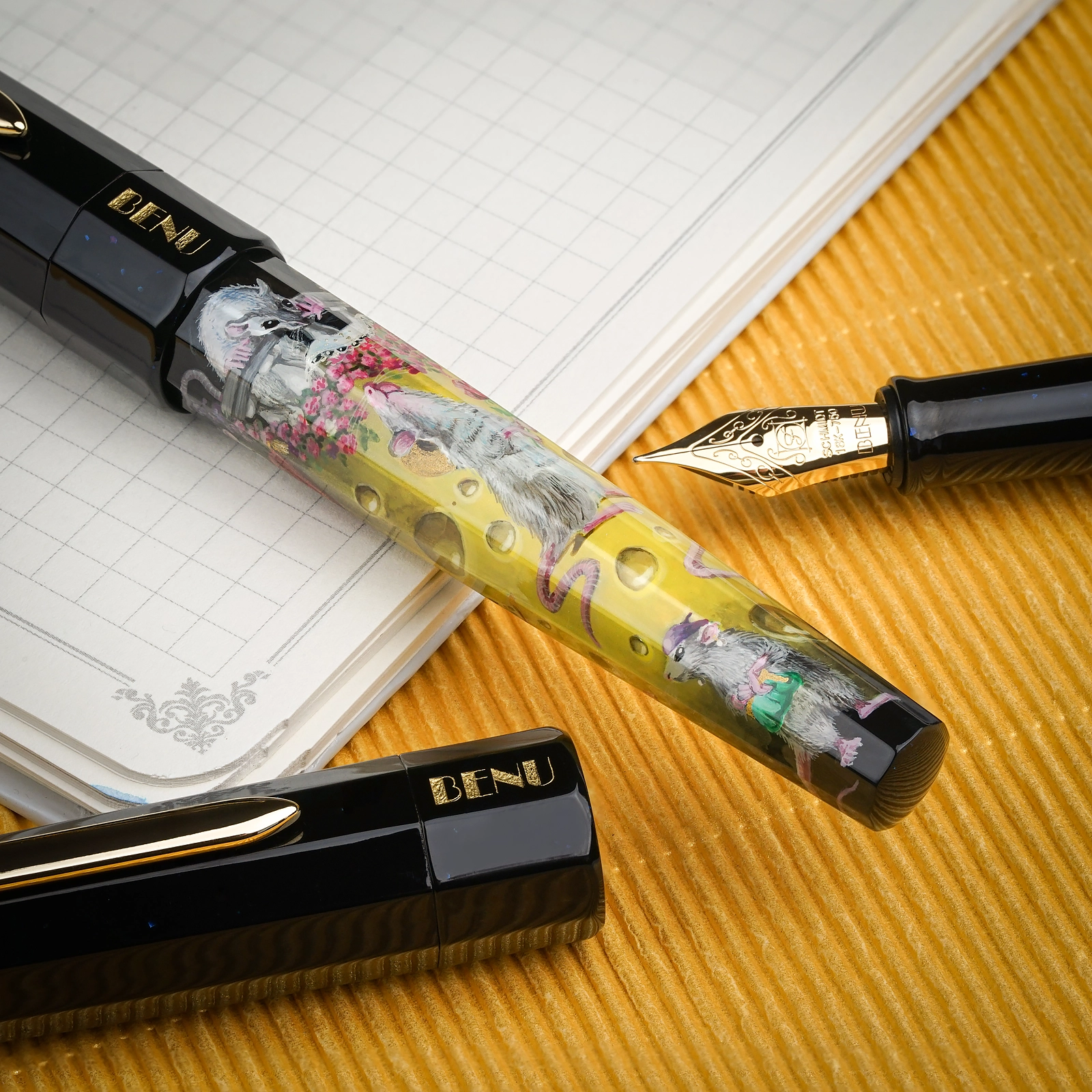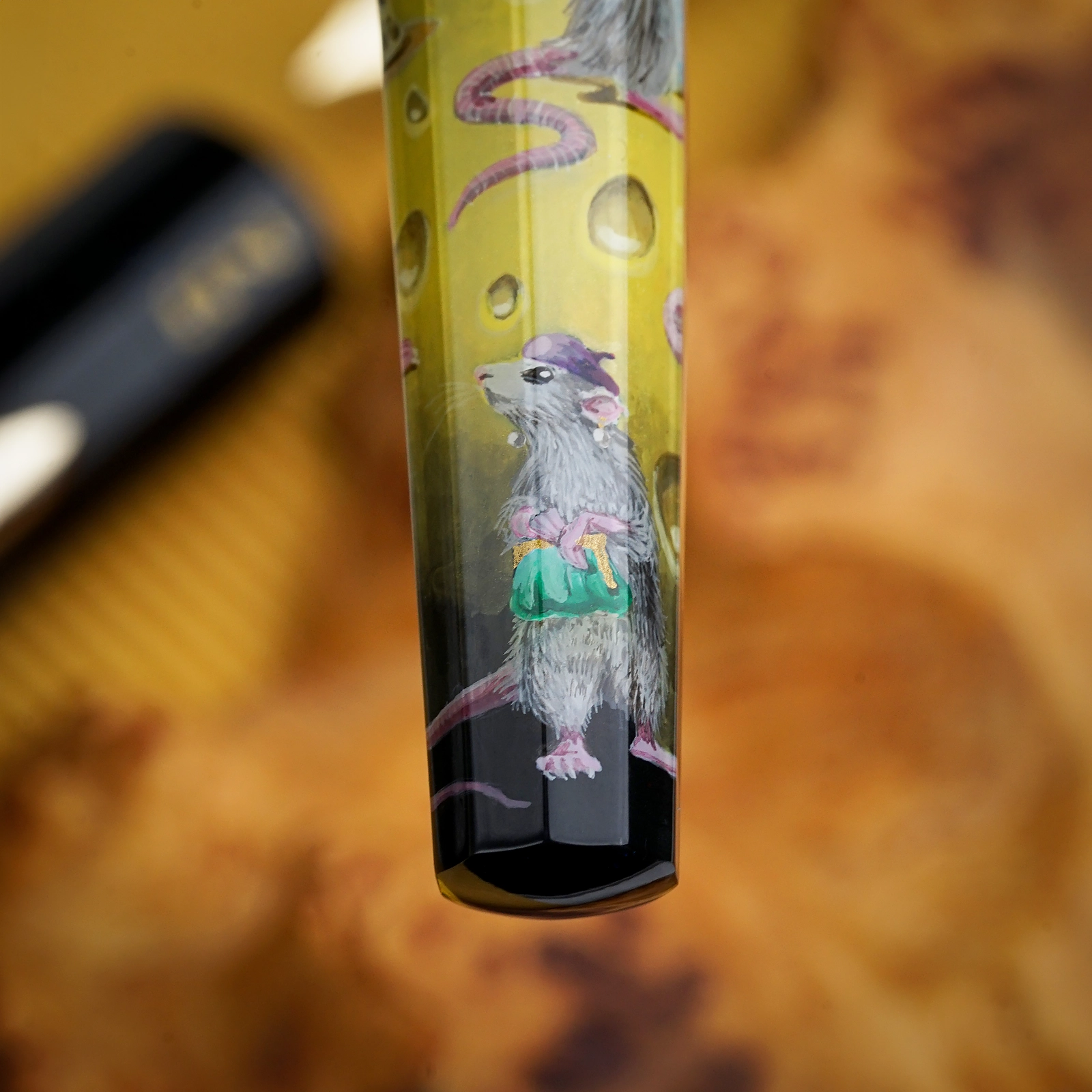 Cheddar Crew is a whimsical hand-painted pen, produced as a unique, one-of-a-kind piece. Set against a bright and cheerful backdrop, the intricate micro-painting artwork portrays a charming scene of whiskered friends indulging in their favorite snack: cheese, of course! Each character is meticulously detailed, bringing the story to life on the pen’s body. The pen features an 18ct gold nib. Explore more photos and videos of this playful creation, available exclusively from BENU’s online store, to fully appreciate its charm and artistry.