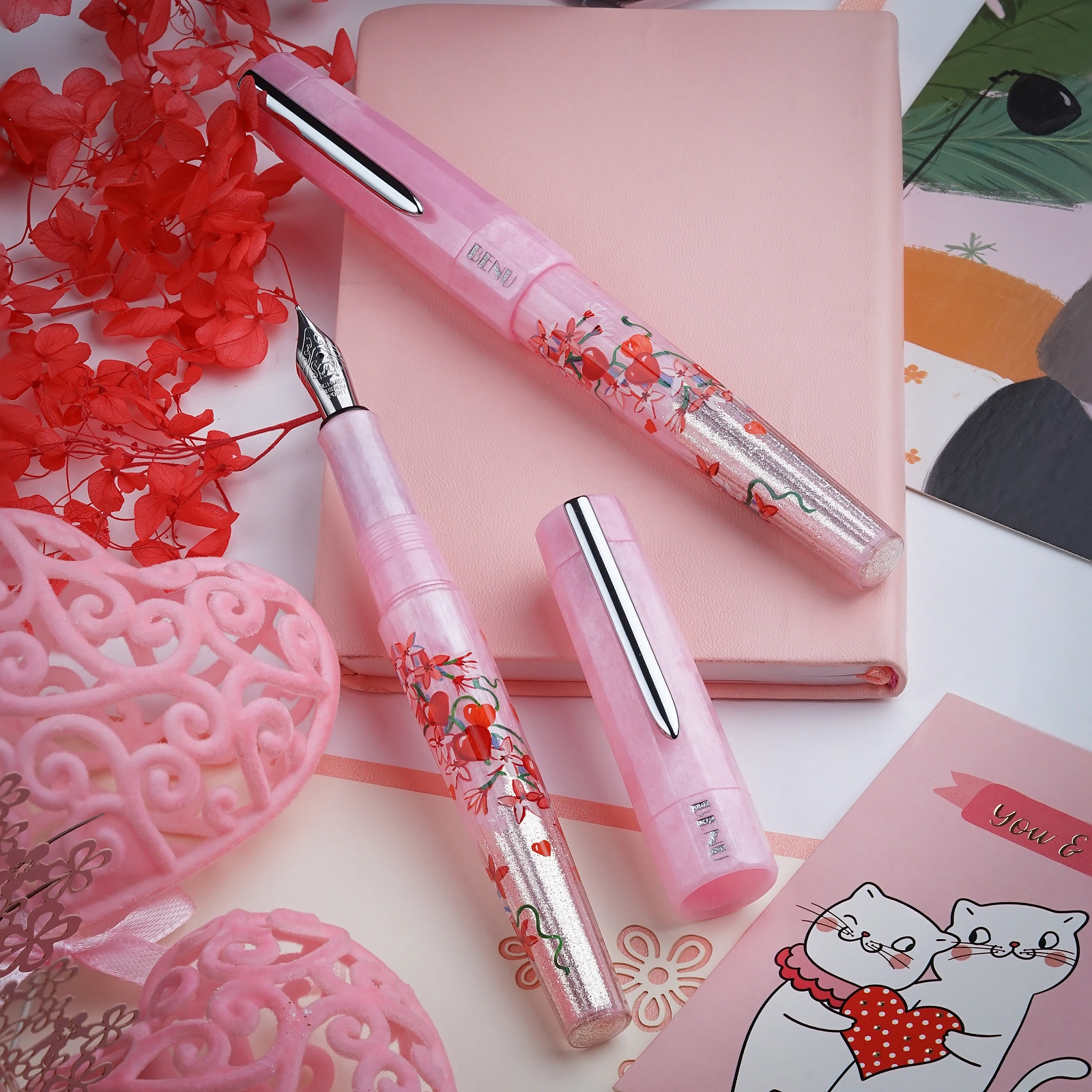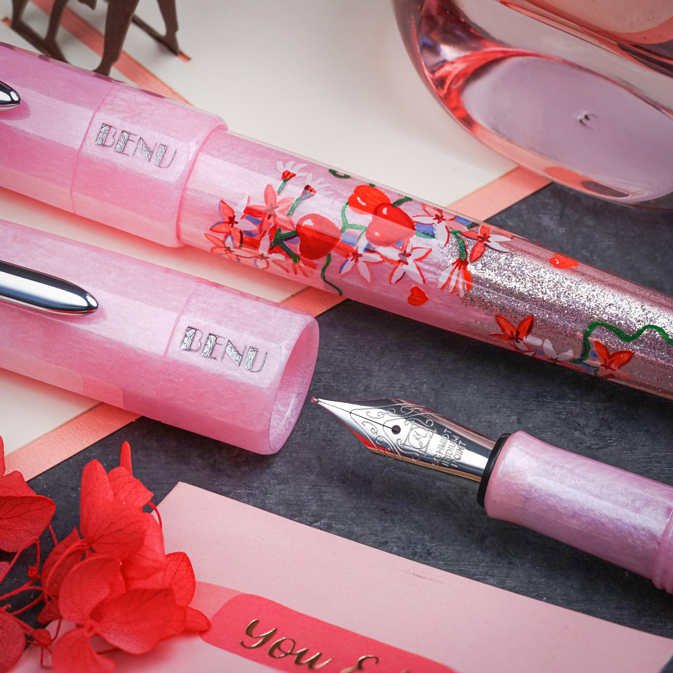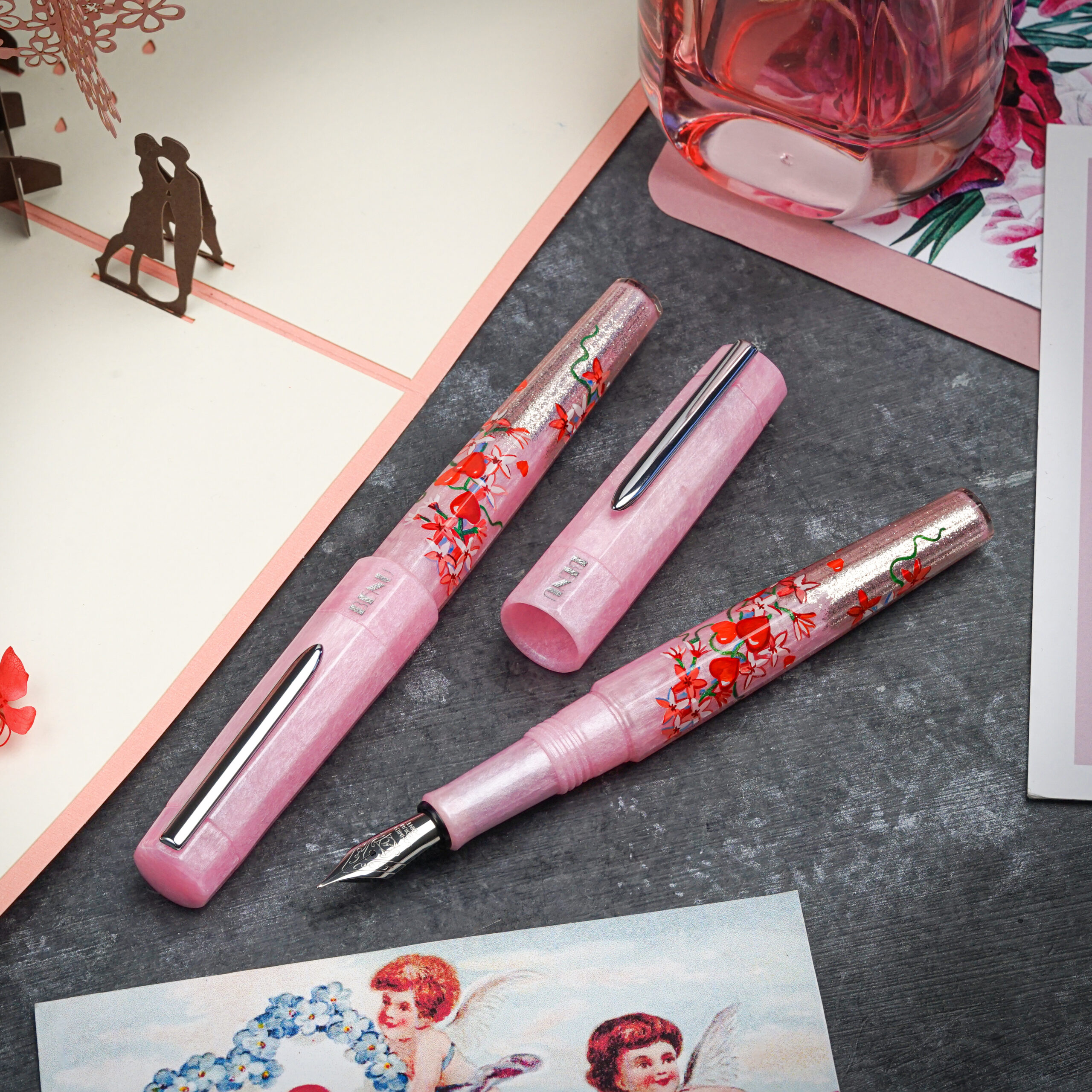 A romantic ode to love, Cupid’s Garden captures the delicate allure of a blooming garden. Hand-painted by our talented artist, Khachatur Abrahamyan, it features a soft pink base adorned with vivid red hearts and climbing blossoms, symbolizing passion and affection. The pen’s body seamlessly transitions into a pearly light pink, beautifully complementing its design. Available exclusively at BENU’s online store.