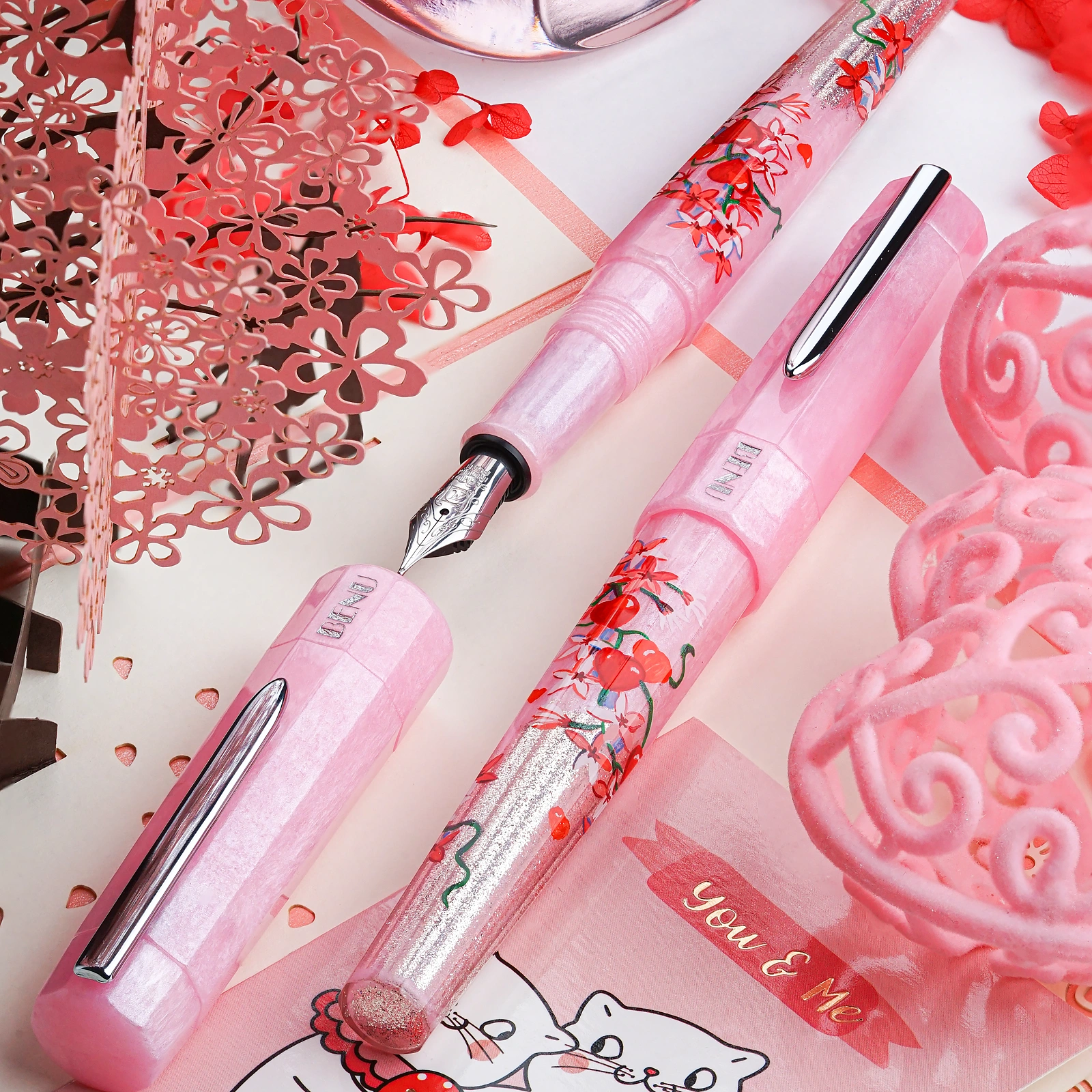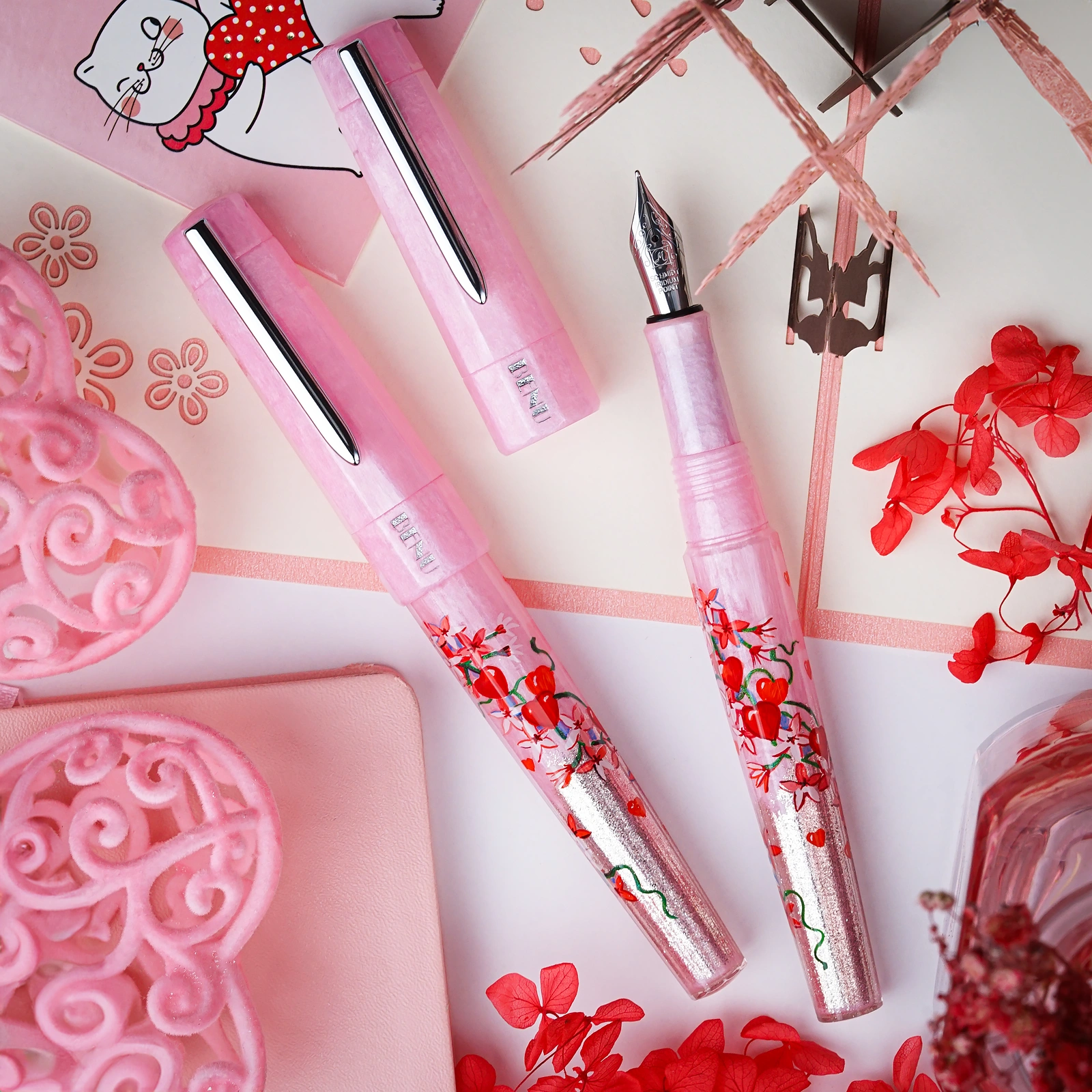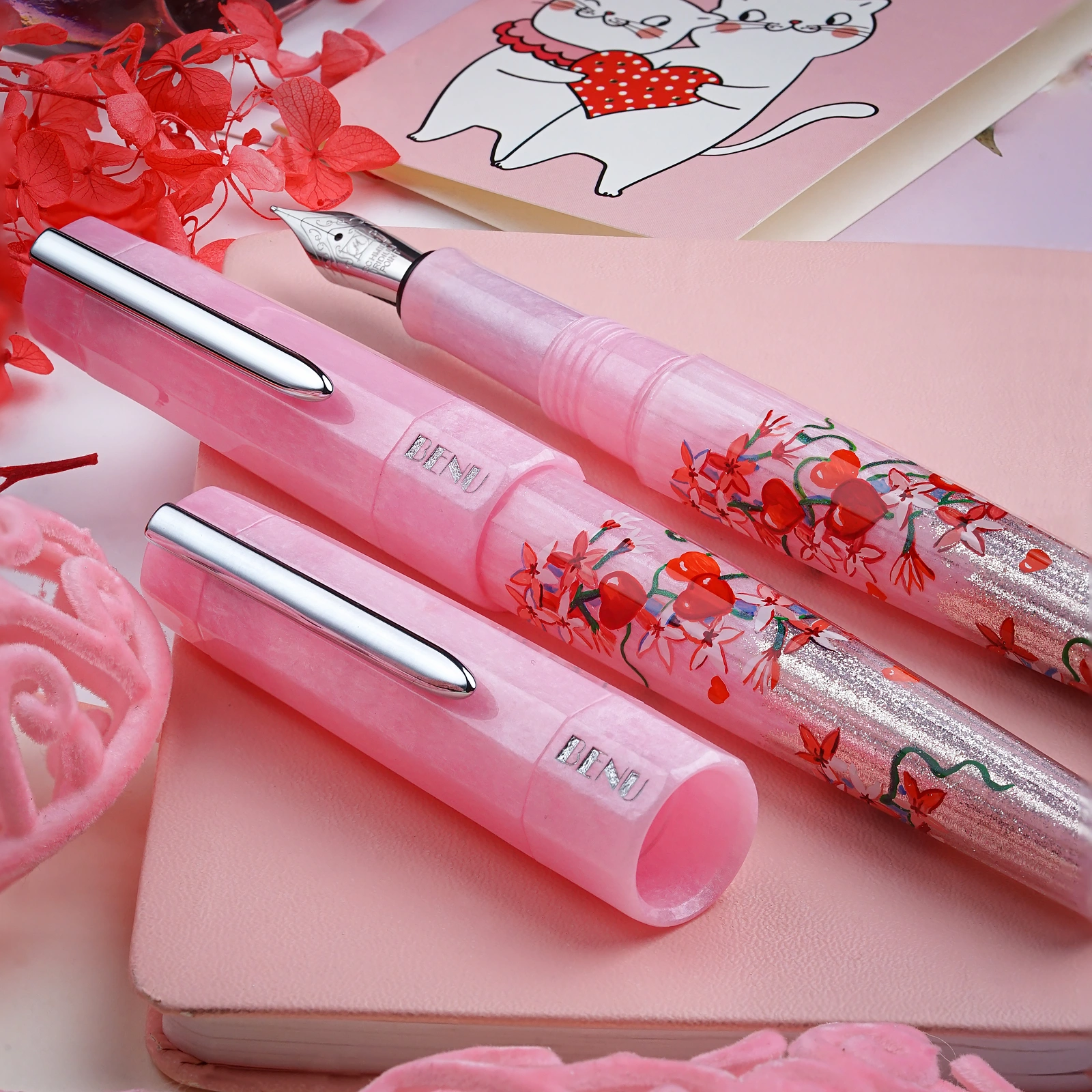 A romantic ode to love, Cupid’s Garden captures the delicate allure of a blooming garden. Hand-painted by our talented artist, Khachatur Abrahamyan, it features a soft pink base adorned with vivid red hearts and climbing blossoms, symbolizing passion and affection. The pen’s body seamlessly transitions into a pearly light pink, beautifully complementing its design. Available exclusively at BENU’s online store.