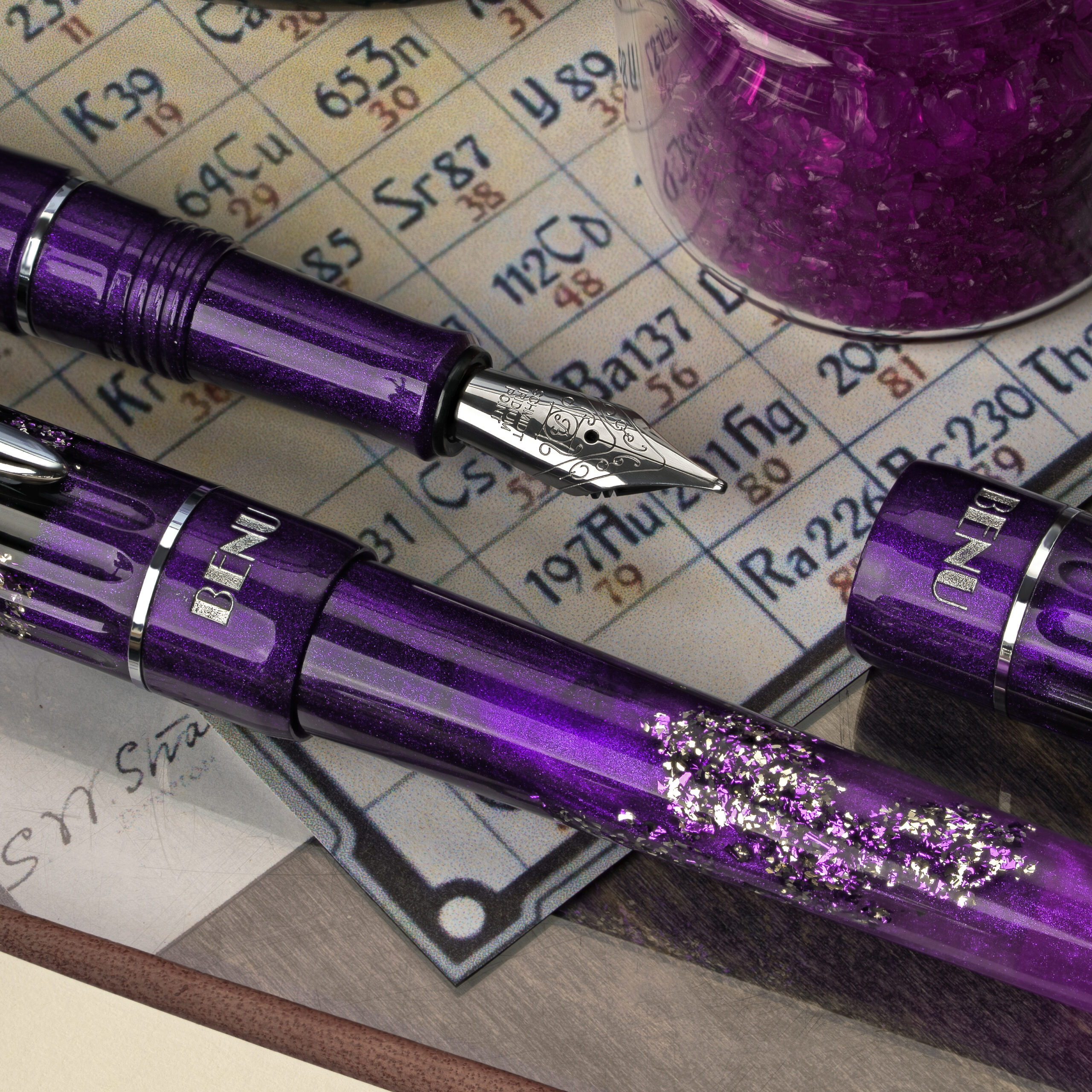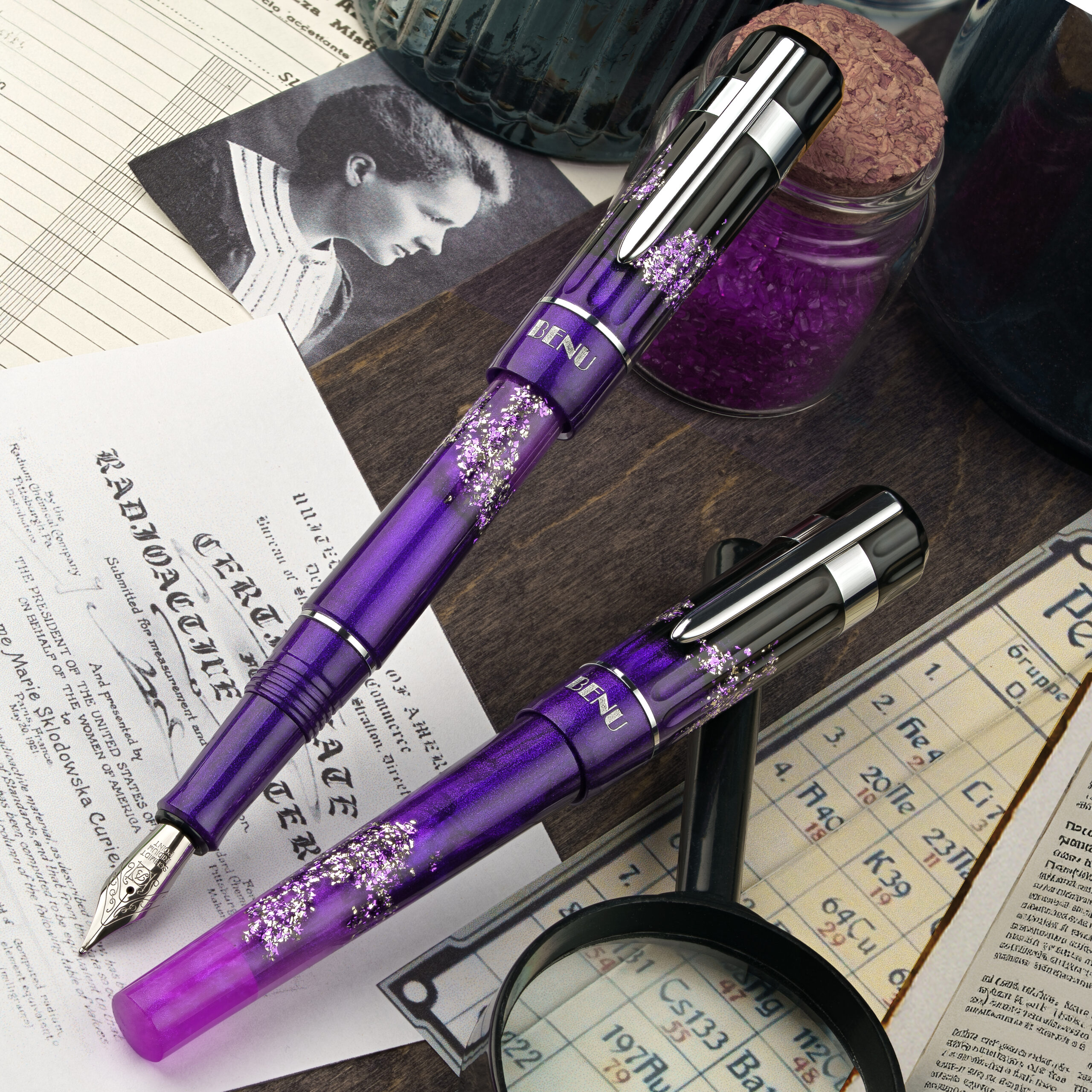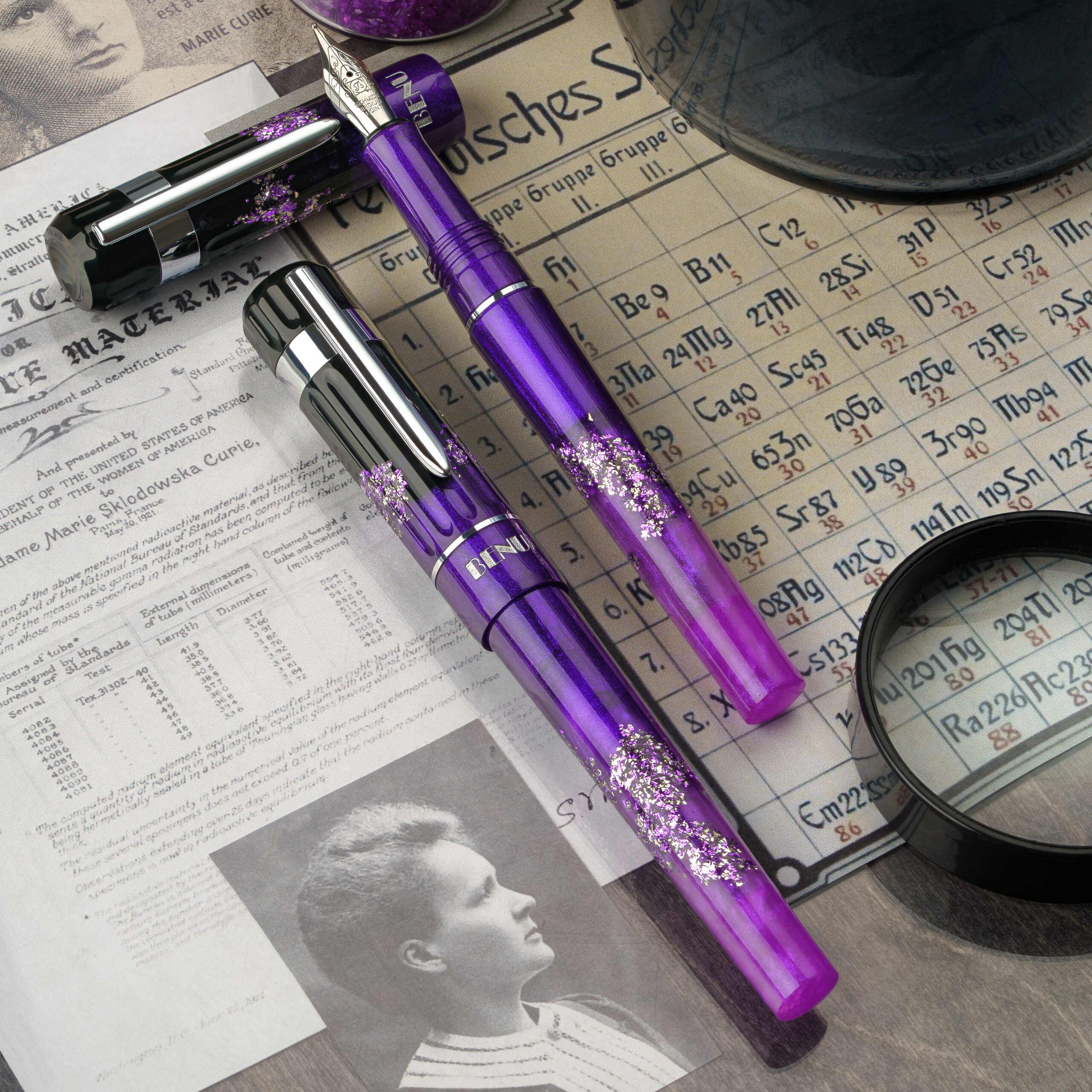 This pen glows with a vibrant gradient from violet to lilac, accented by shimmering highlights and finished with sleek silver hardware — evoking the quiet intensity of lab light, rare elements, and scientific revelation. Curie celebrates the courage to question, the determination to experiment, and the brilliance that redefines knowledge itself. For those who seek truth not only in what is known but in what awaits discovery.