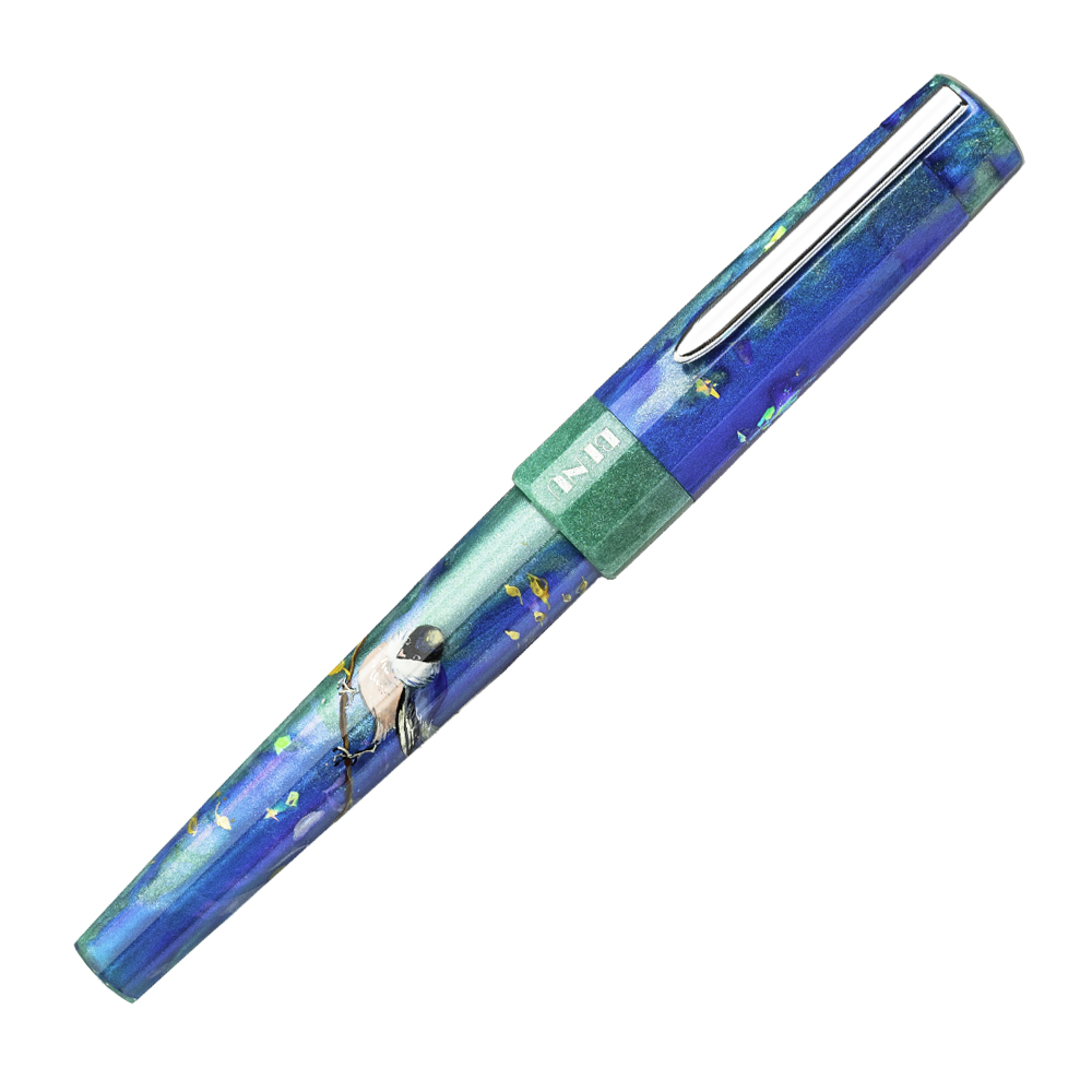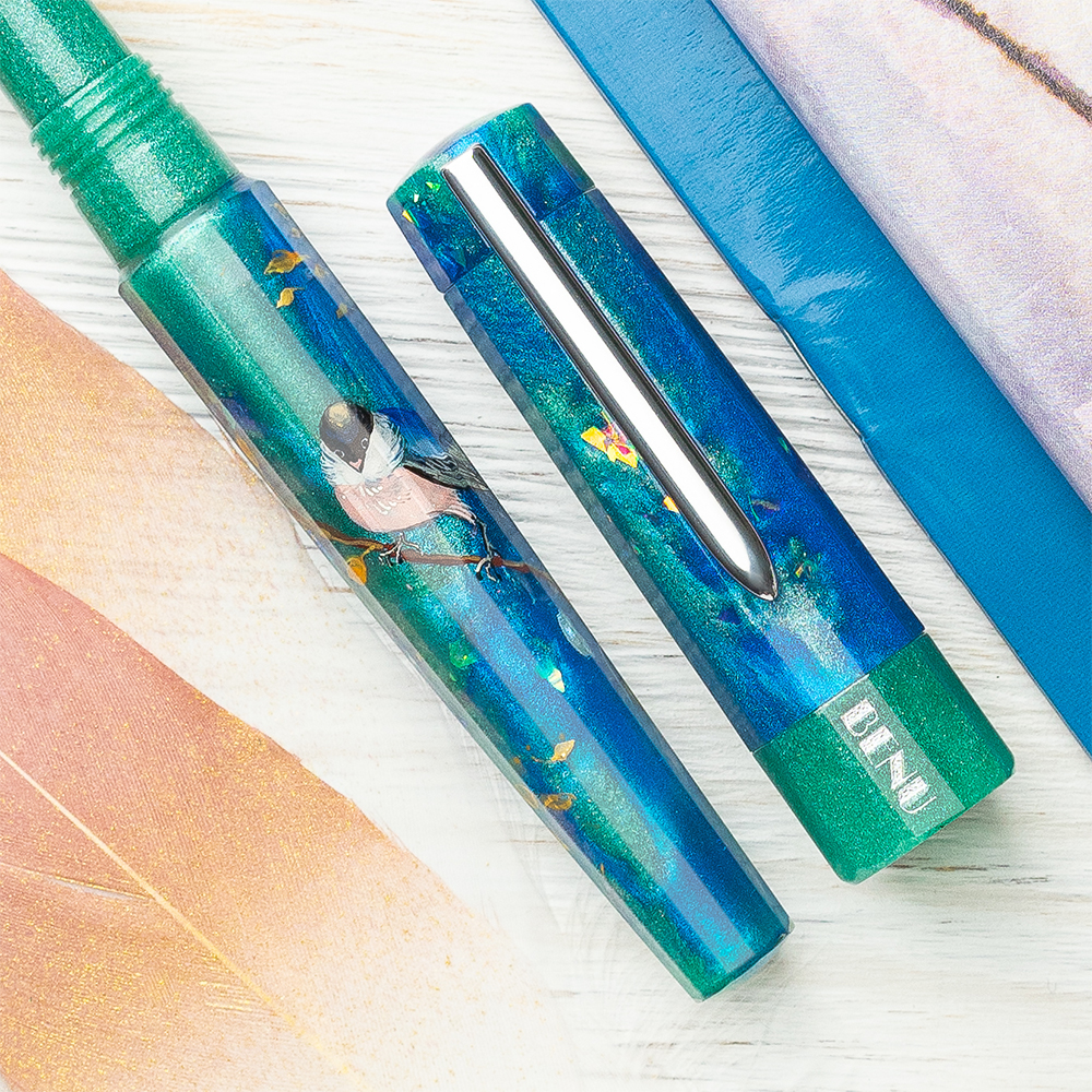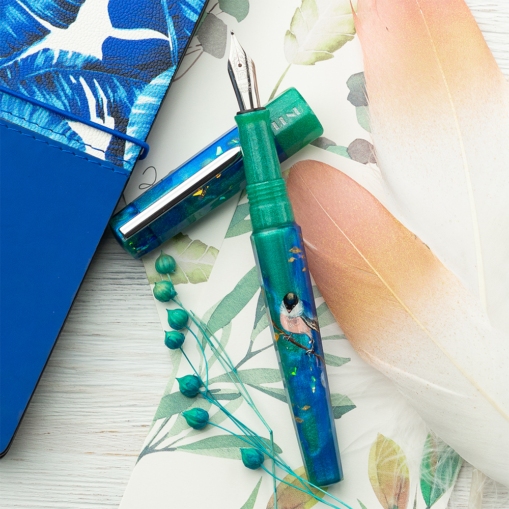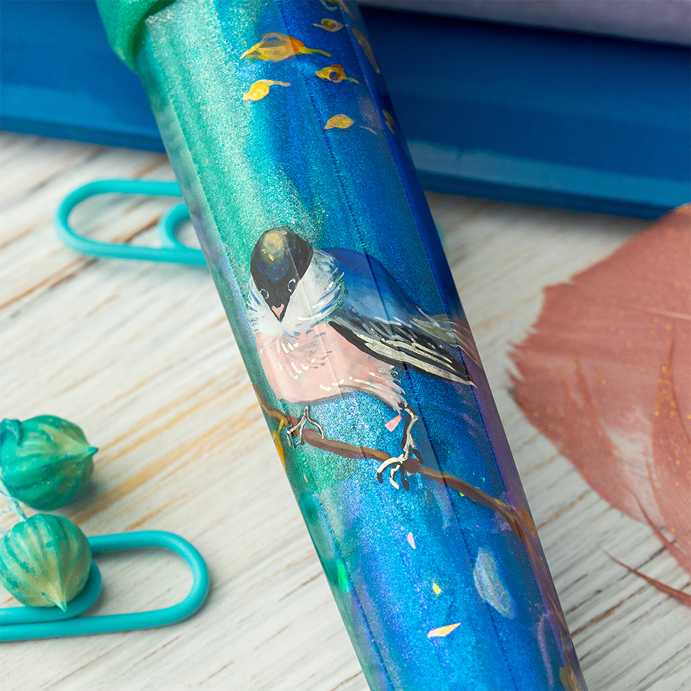 This delicate pen features a pearlescent material that combines heavenly-blue and grass-green, conveying the beauty of the early morning and a new day ahead. Showcasing a bird sitting on golden branches, this work-of-art is refreshing, vibrant, and optimistic. This pen has been lovingly handmade and hand painted with a series of multicolored layers. This process takes up to 5 days to complete and results in the pen’s impressive depth of colors and unique glare.