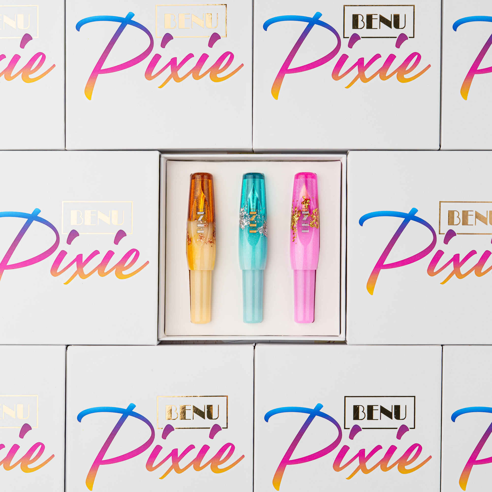 Enchanted Pastels is a fresh trio in our Pixie collection, designed to bring soft sparkle to your everyday writing. The palette includes a soothing blend of colors that feel both playful and serene: a creamy peach base that fades into rich amber with bronze flakes, a bright bubblegum pink with a golden sparkle, and a refreshing aqua that shifts into cool teal, accented with silver shimmer. Each pen showcases a beautiful gradient and glitter finish that brings light and movement to its design. With their compact size and smooth form, they’re as functional as they are beautiful.