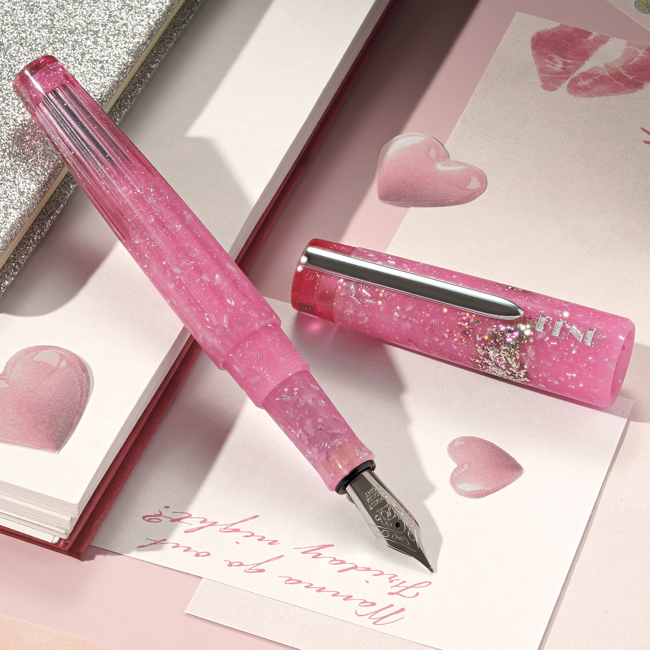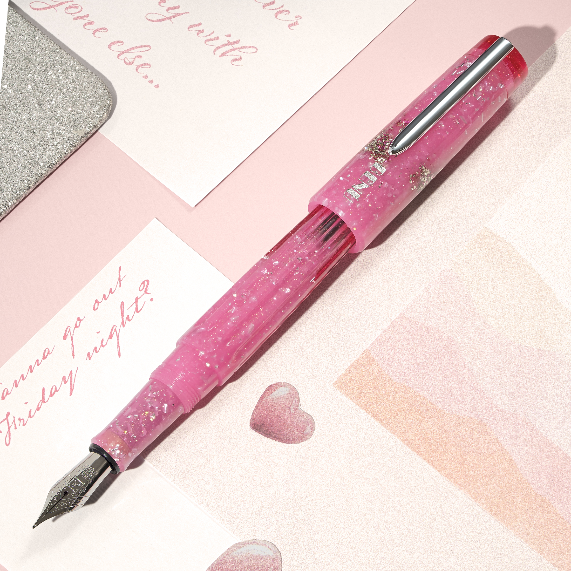 Bold, bright, and brimming with playful energy, Flirty Friday is your perfect pre-weekend pick-me-up. Drenched in dazzling pink and sprinkled with silver sparkle, this pen adds a little mischief and a lot of fun to your day. Finished with a sleek silver clip and a wink of glam, it’s made for writing sweet notes, spontaneous plans, and anything your heart dreams up.