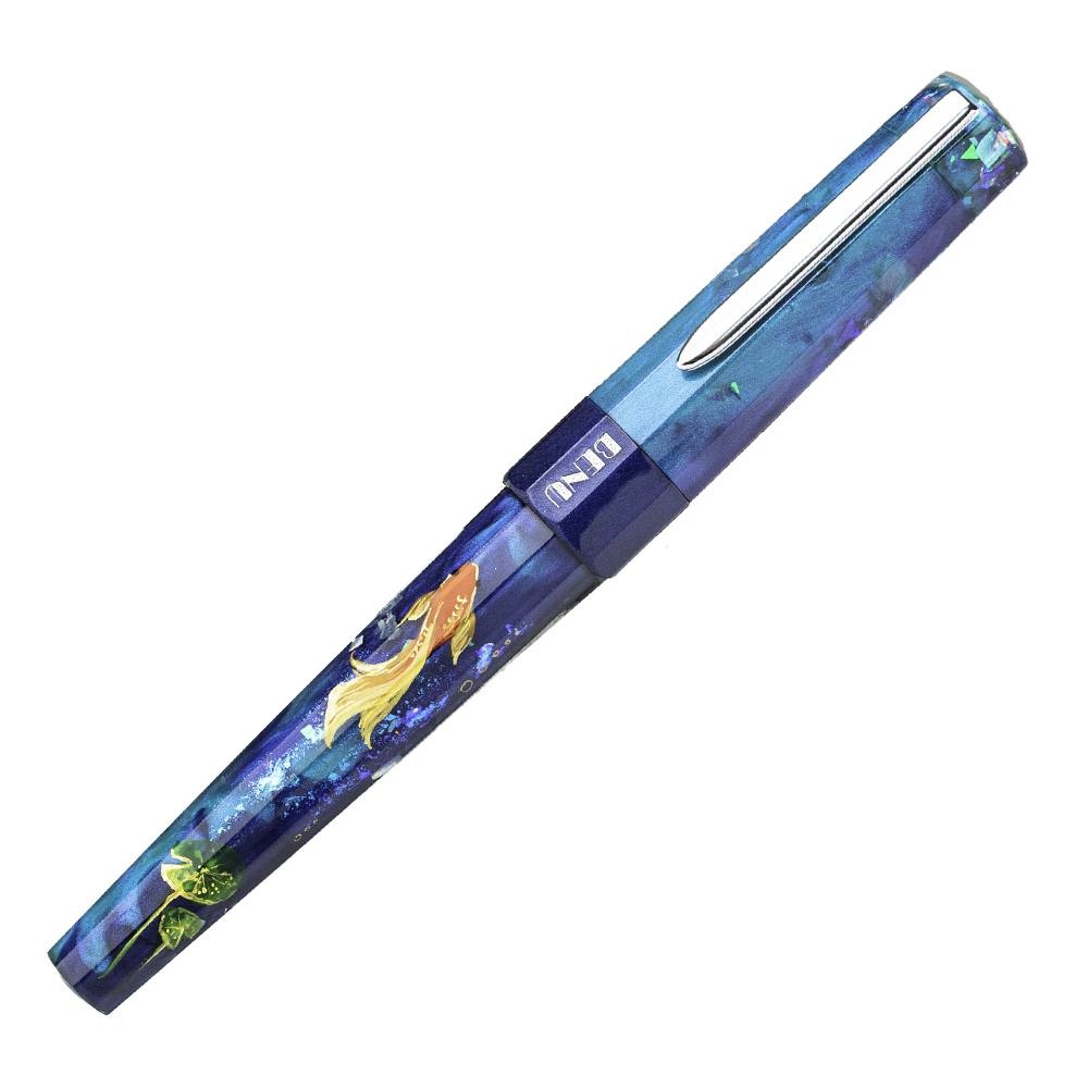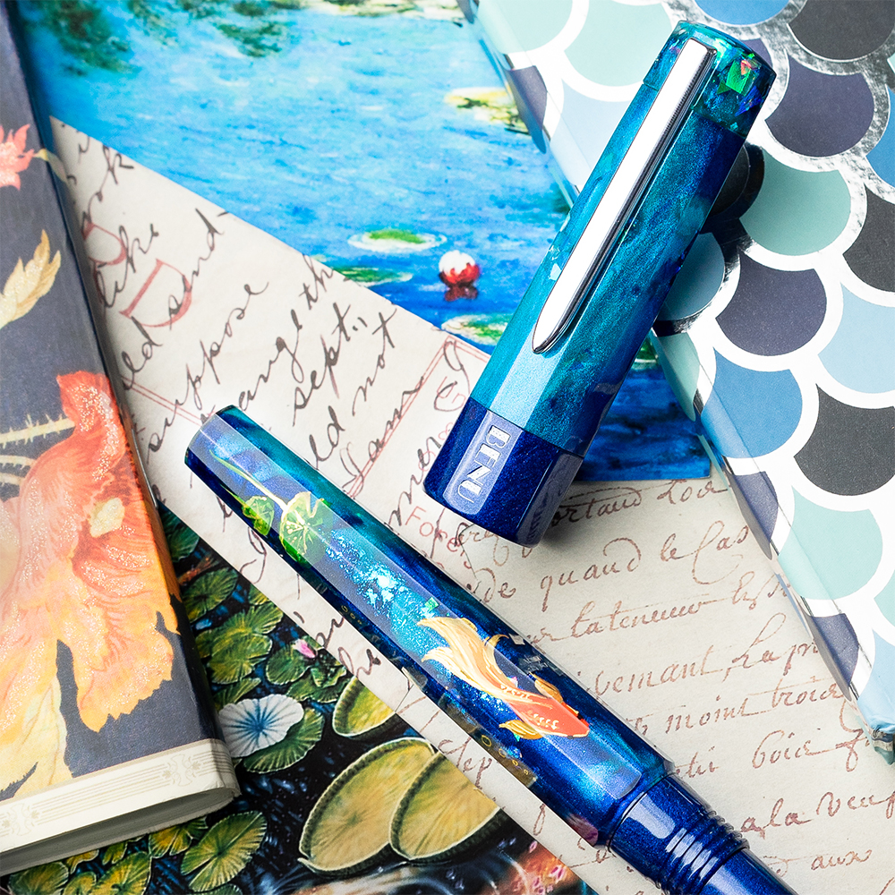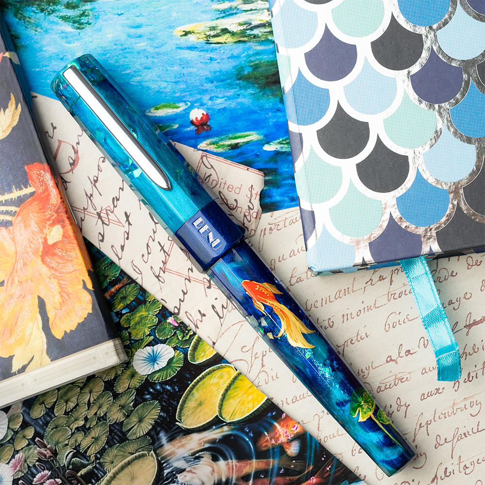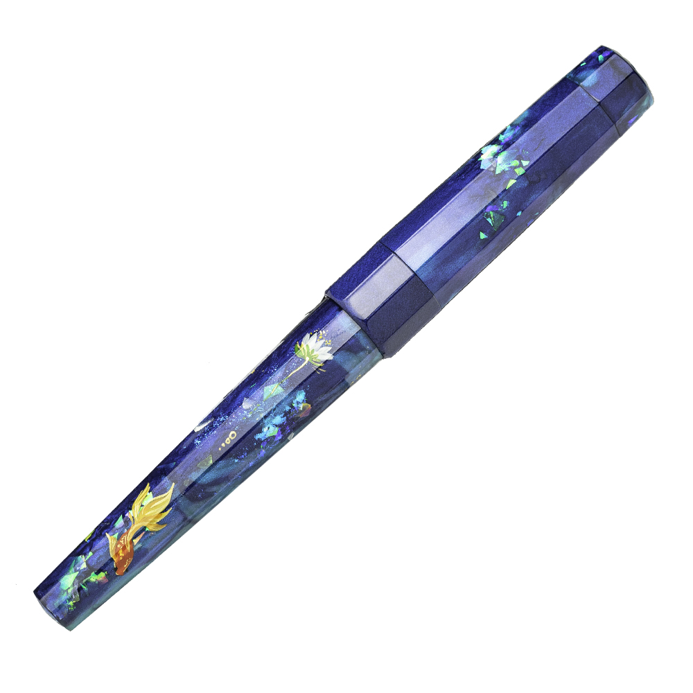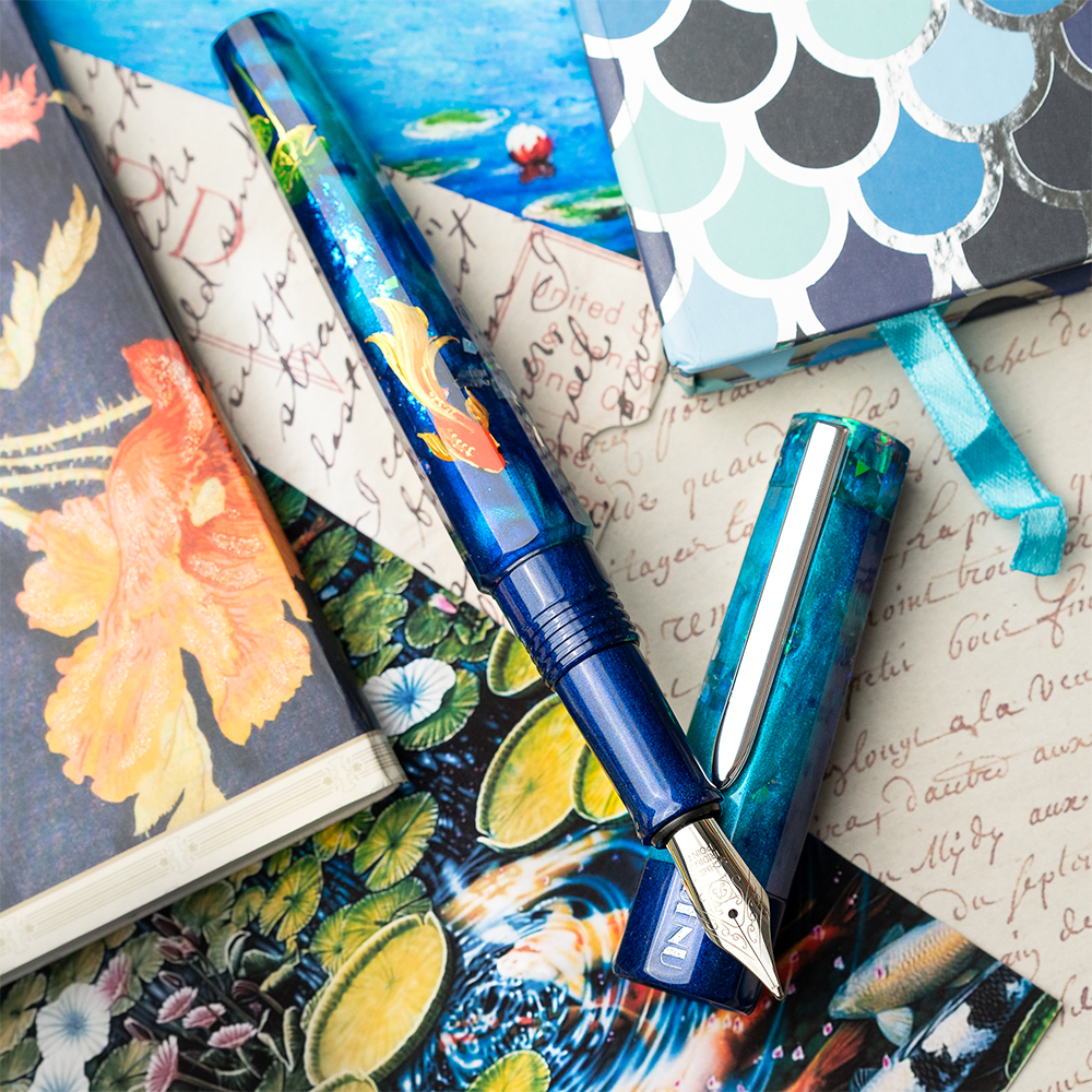 The Forest Pond fountain pen features hand-painted gold fish and white water lilies, set to a pearly aqua-blue background. Blue and green glitter foil added to the pen’s material creates an illusion of the play of light in the depths of a forest pond, adding vibrancy and vividness. A true piece of art, this unique pen is available exclusively from our online store.