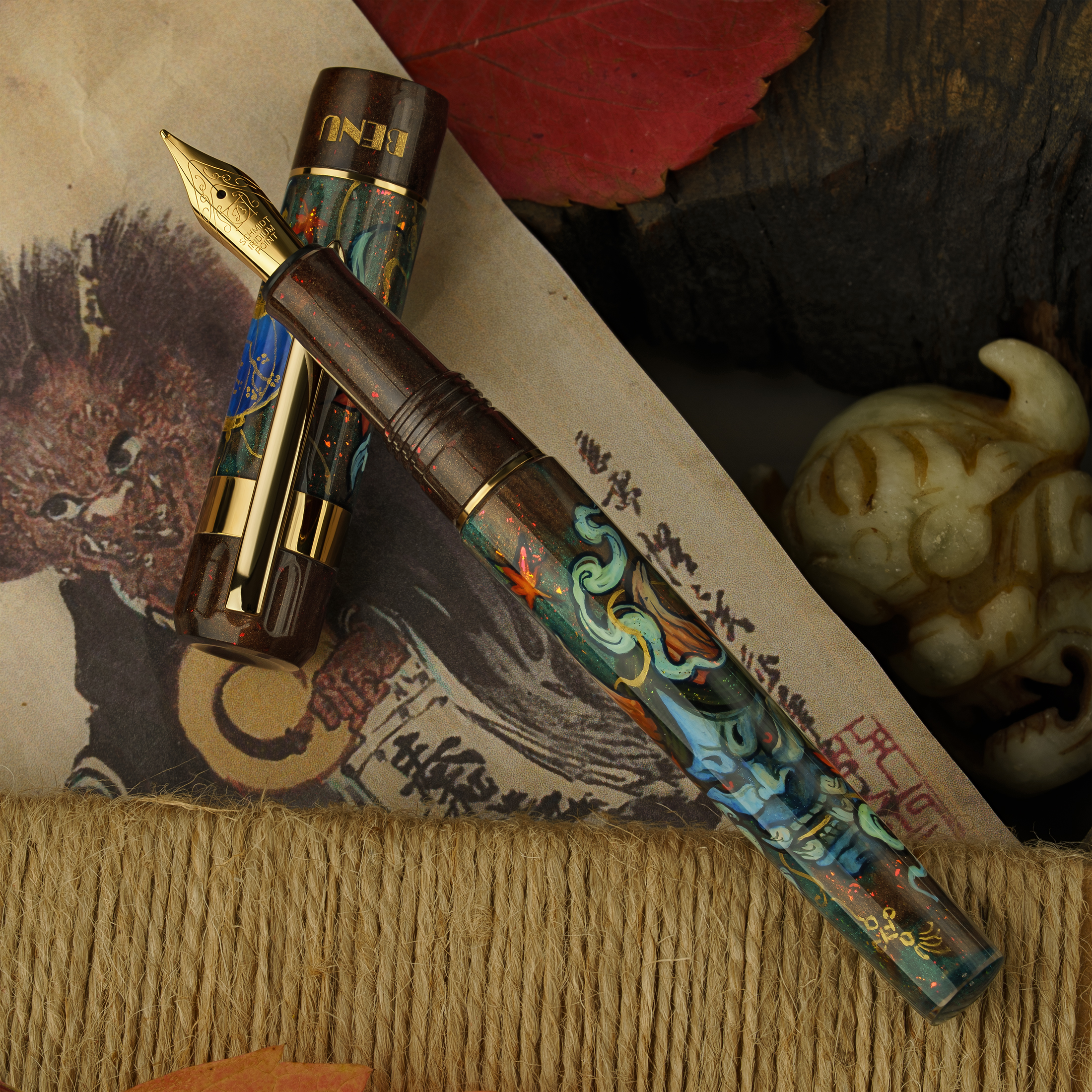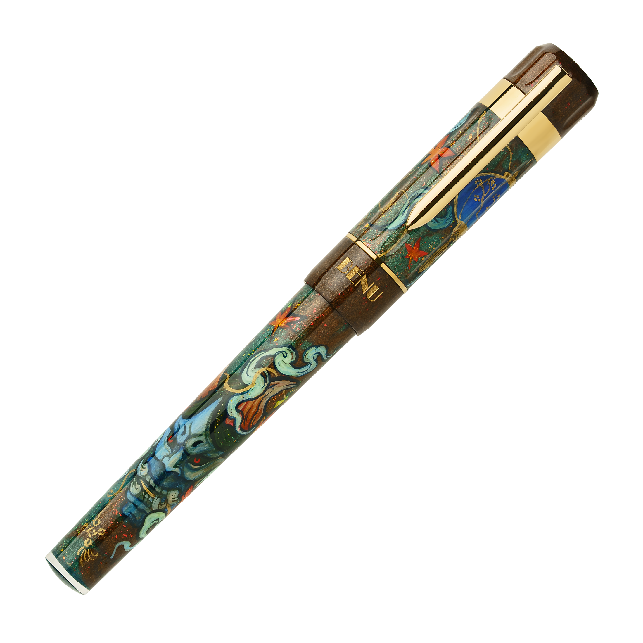 In this hand-painted piece, BENU pays homage to that tradition through intricate, expressive artwork. The pen’s body features the iconic Hannya mask, surrounded by curling smoke and fiery bursts that echo the raw drama of the stage. Subtle decorative elements symbolize the balance between emotion and control, chaos and beauty.