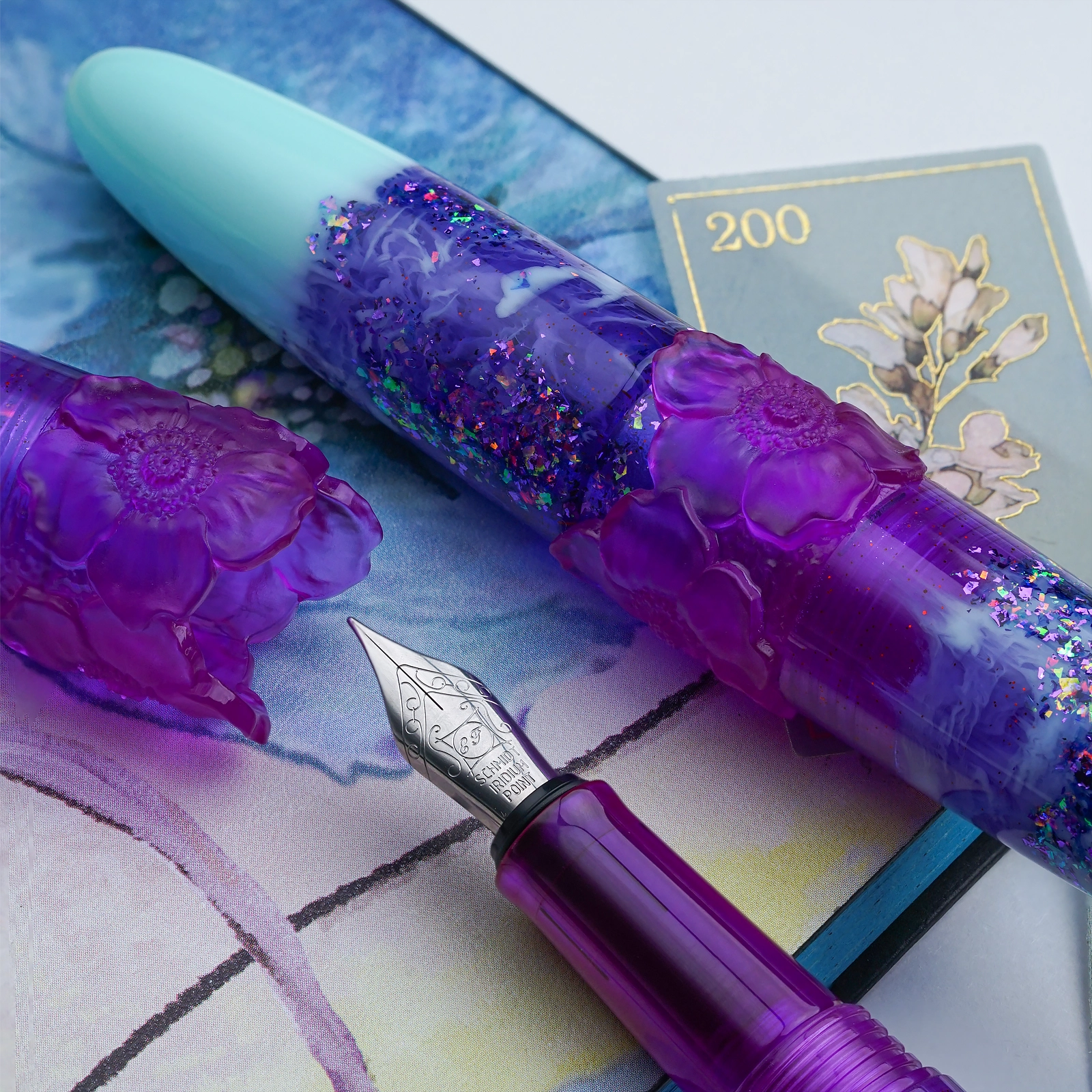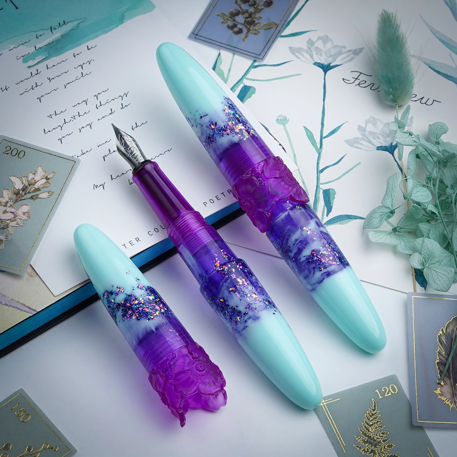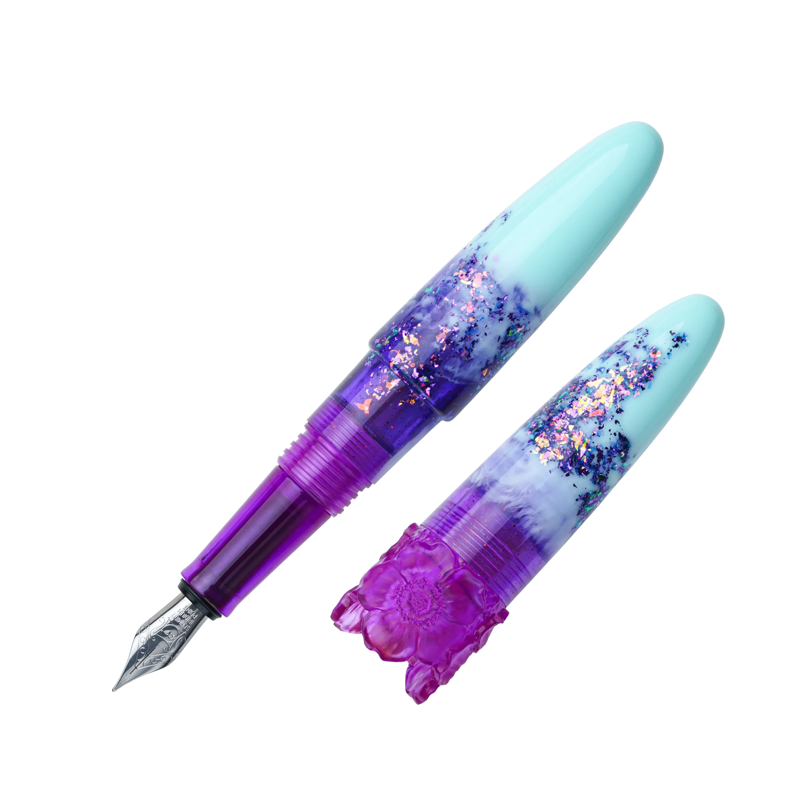 Graceful and captivating, Hyacinth is a stunning addition to our exclusive Ambrosia collection. This exquisite design features a soothing blend of soft mint green and deep violet hues, enhanced by iridescent sparkles that are reminiscent of a blooming hyacinth in the morning dew. The pen is adorned with an embossed floral motif ring, thoughtfully designed to not only elevate its unique charm but also to prevent it from rolling. Available exclusively from our online store.