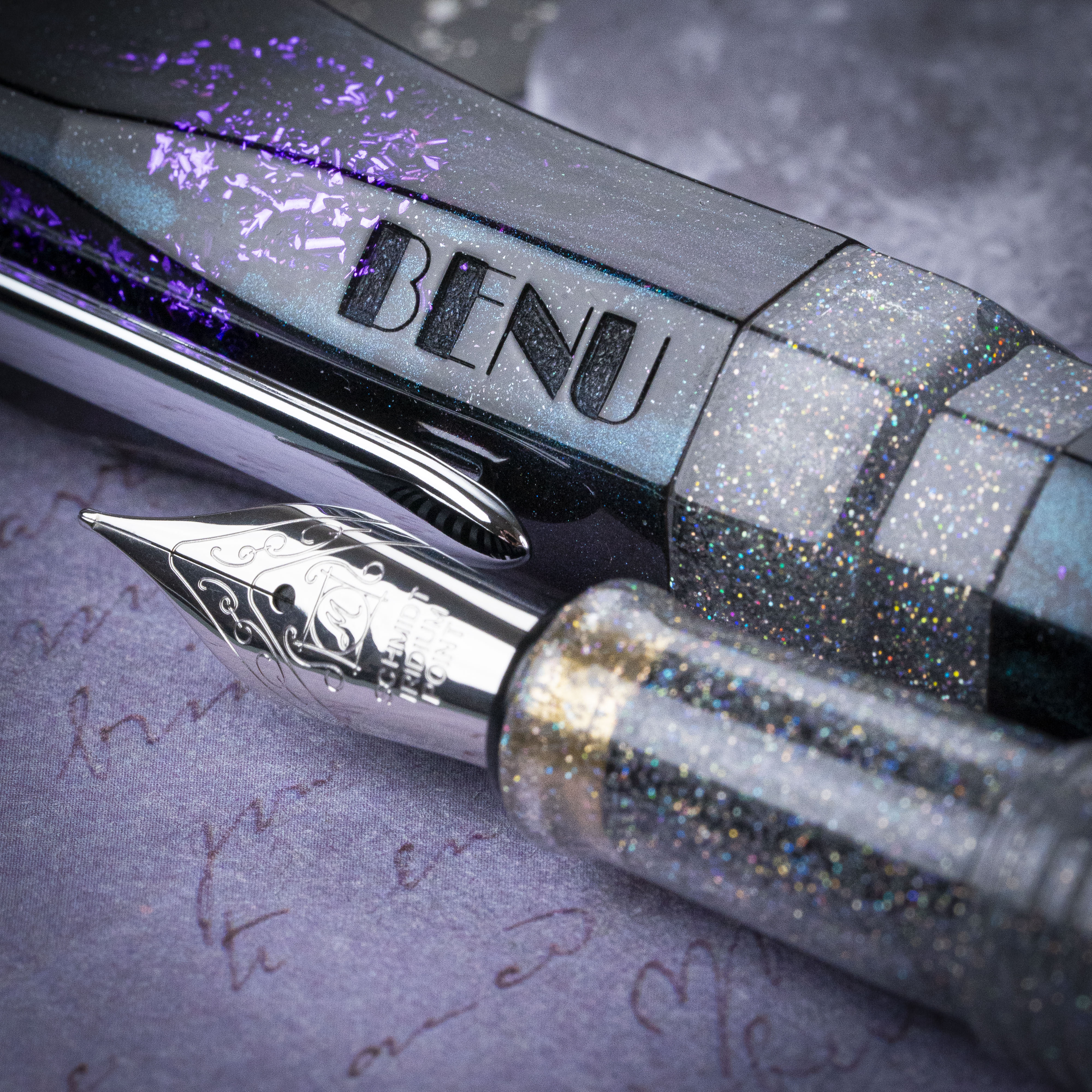 Part of the AstroGem collection inspired by the shape of the interstellar asteroid, Oumuamua, the Klio pen gained its name from a large and very dark main-belt asteroid, discovered by R. Luther on August 25, 1865, and named after Klio, the Muse of history in Greek mythology. Created in a dusty green shade interwoven with graphite color and contrasted with a rich addition of purple sparkles, the Klio pen proves that even interstellar objects can be flamboyant and colorful when designed by BENU!