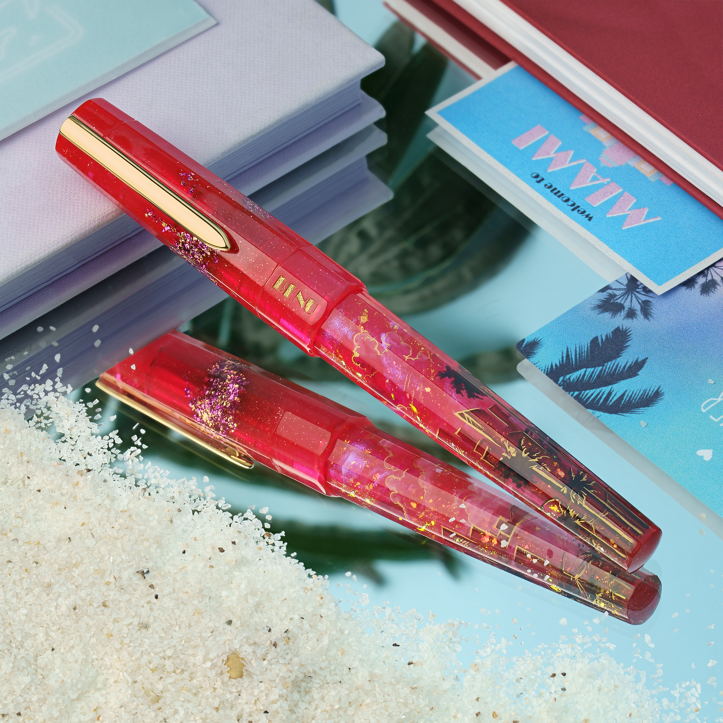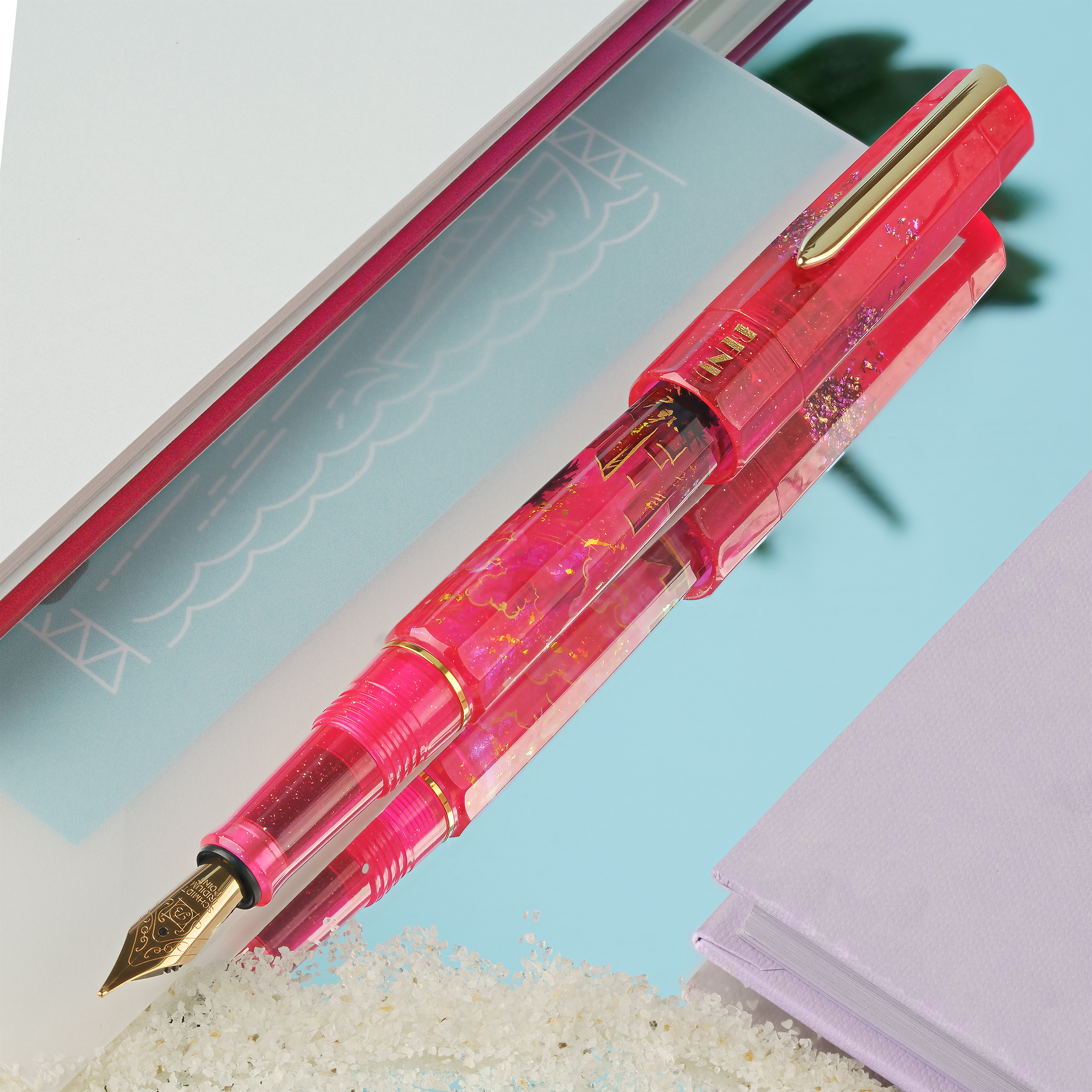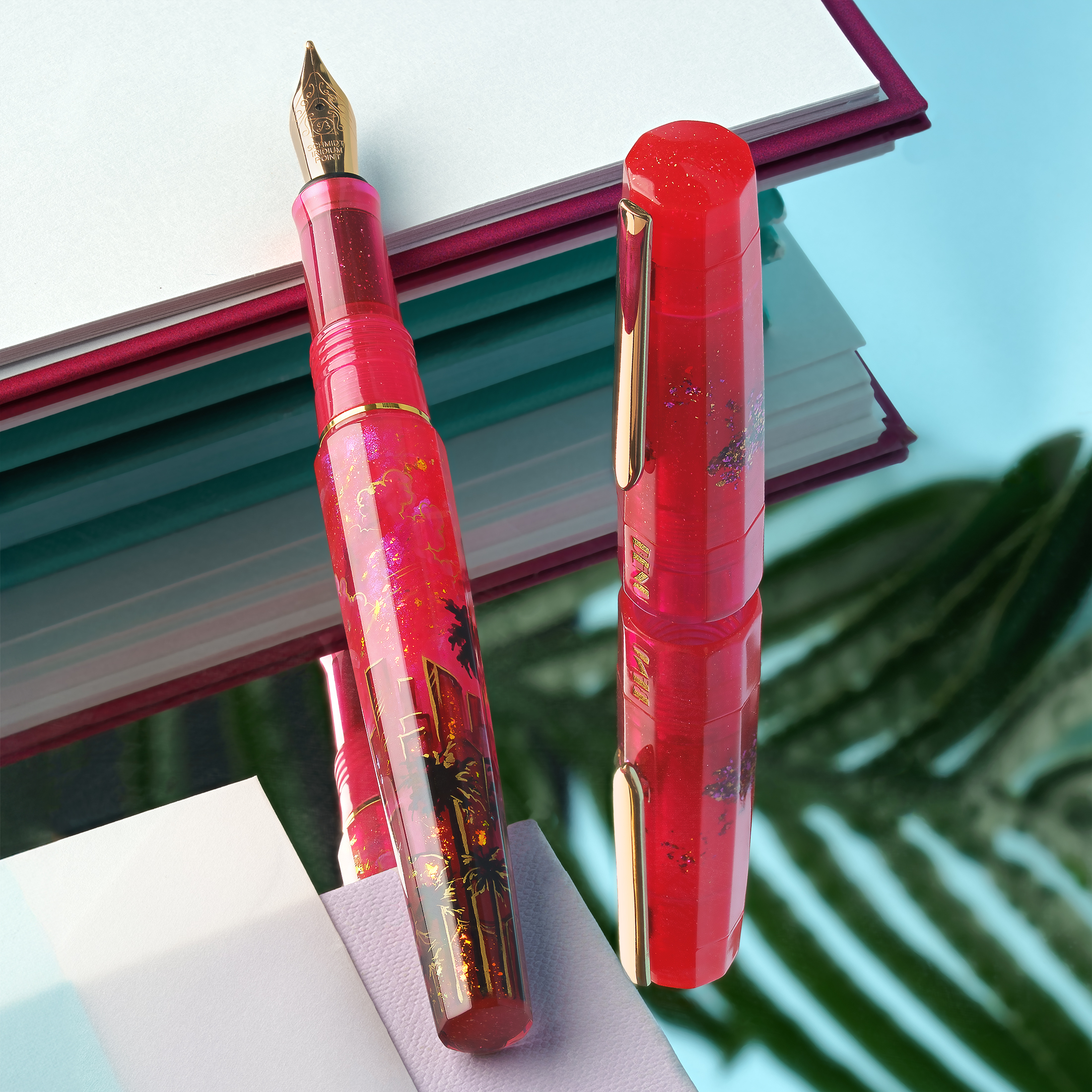 Bask in the glow of paradise with Miami Sunset, a hand-painted celebration of the city where pastel skies melt into ocean waves and nightlife shimmers just beneath the horizon. Drenched in vibrant shades of magenta and flamingo pink, this pen pulses with the energy of palm-lined boulevards, beachside neon, and tropical twilight skies. Shimmering gold flakes dance across the body like city lights flickering to life, while subtle silhouettes of skyscrapers, swaying palms, and a distant shoreline evoke a dreamy skyline bathed in sunset glow.