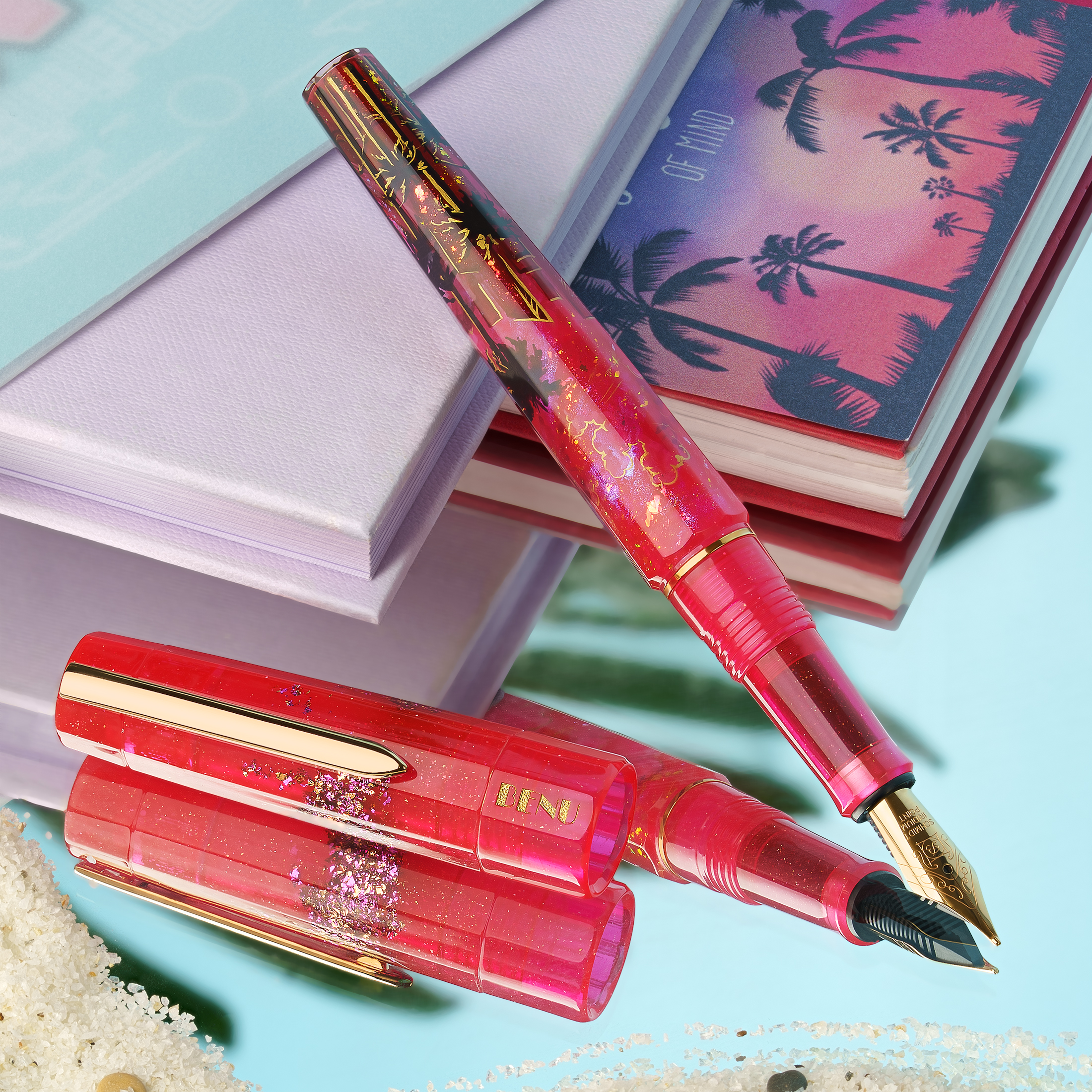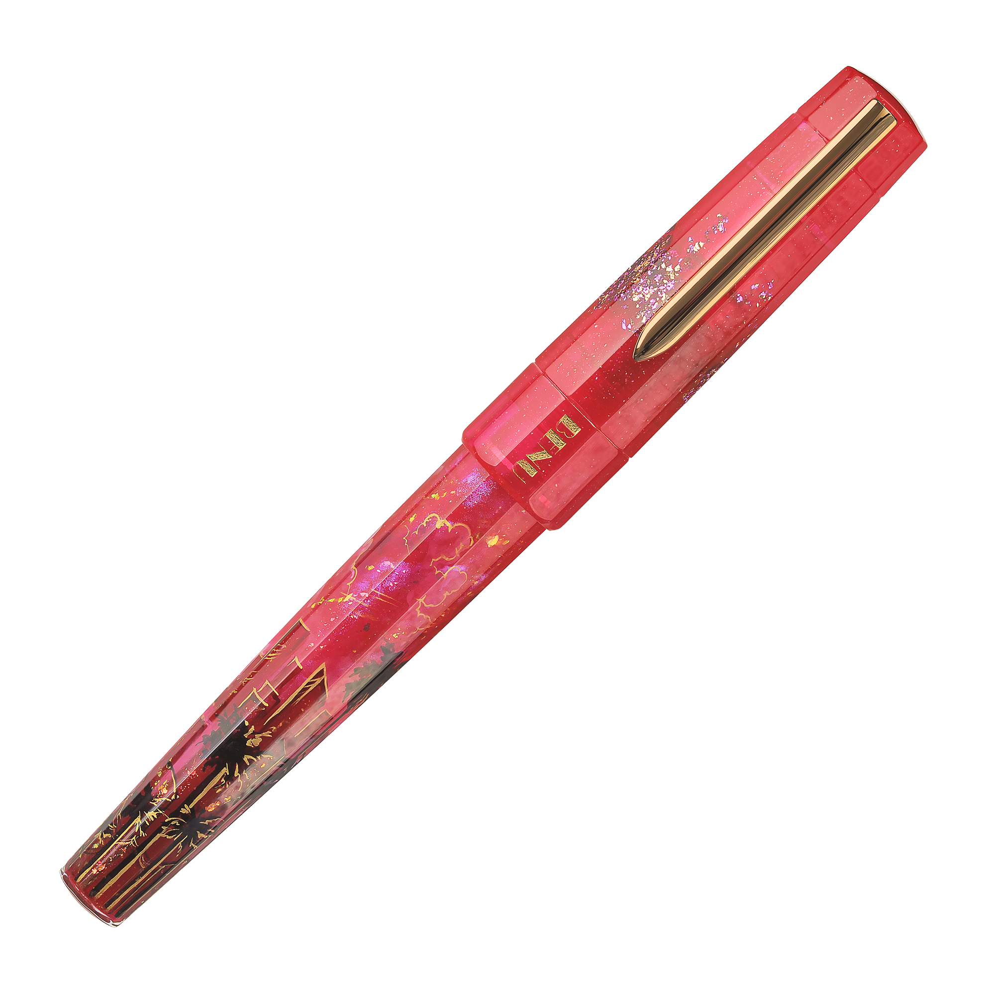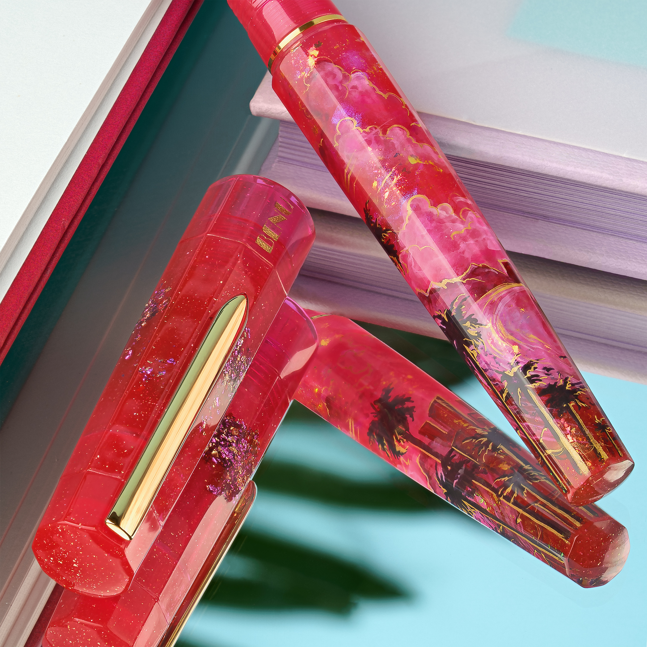 Bask in the glow of paradise with Miami Sunset, a hand-painted celebration of the city where pastel skies melt into ocean waves and nightlife shimmers just beneath the horizon. Drenched in vibrant shades of magenta and flamingo pink, this pen pulses with the energy of palm-lined boulevards, beachside neon, and tropical twilight skies. Shimmering gold flakes dance across the body like city lights flickering to life, while subtle silhouettes of skyscrapers, swaying palms, and a distant shoreline evoke a dreamy skyline bathed in sunset glow.