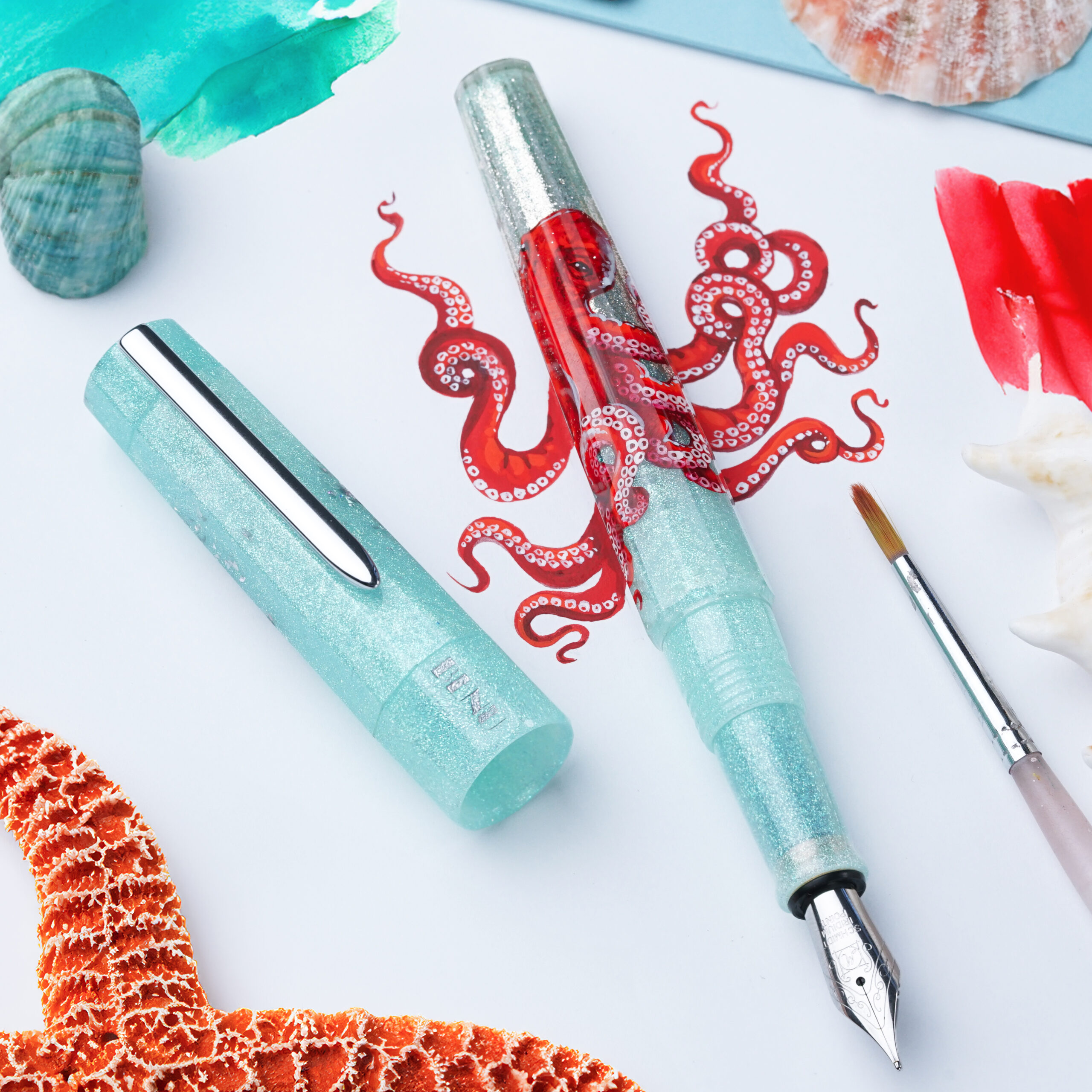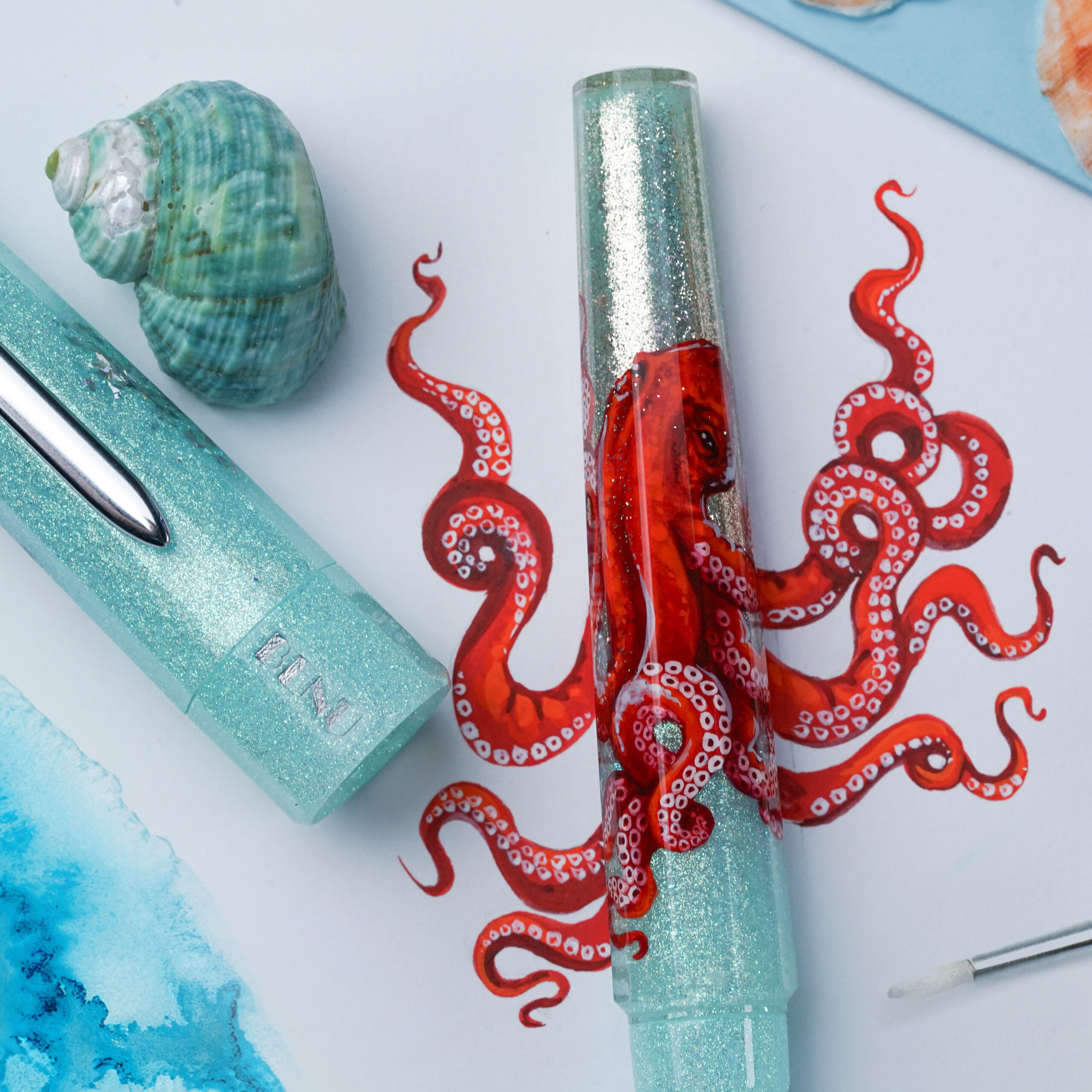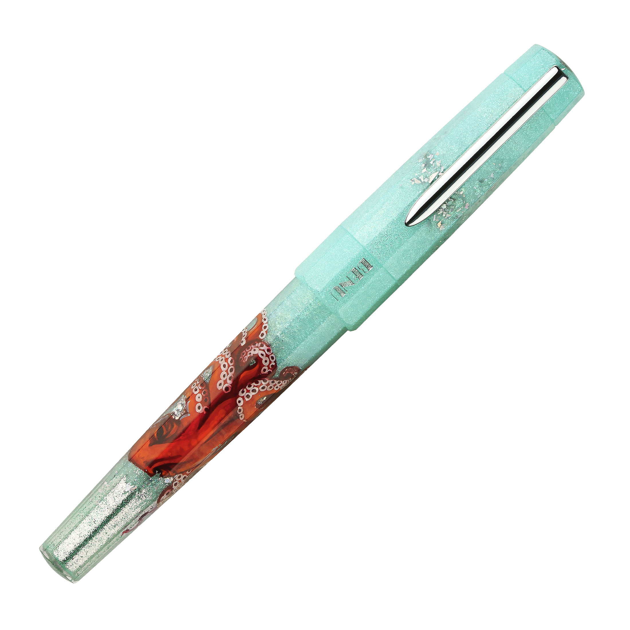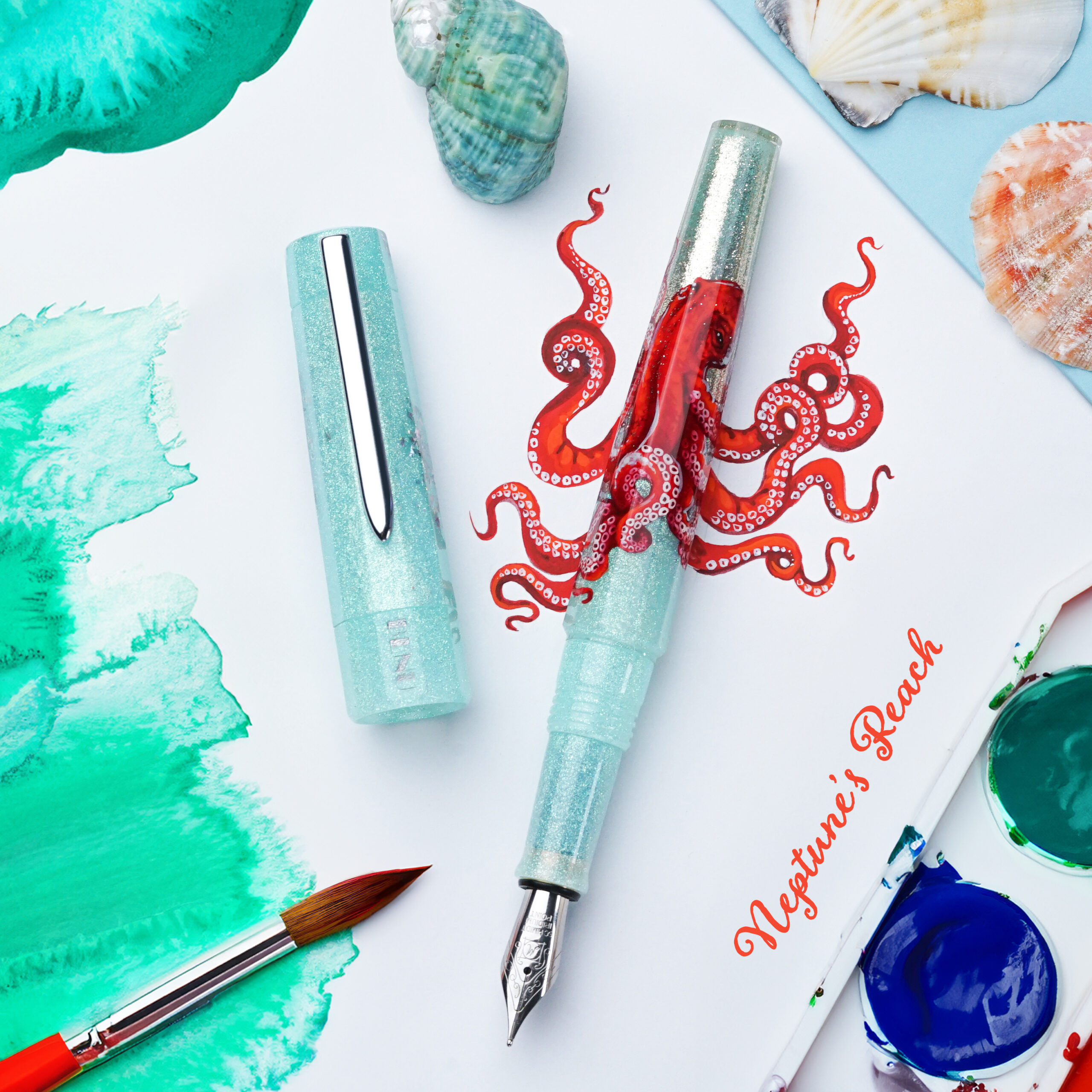 Neptune’s Reach is an exquisite hand-painted piece, rendered in an ocean-blue azure color that seamlessly transitions into pearly-silver to evoke the reflection of the sun on the surface of water. The pen features a red octopus masterfully hand-painted by the talented Natalia Doronkina. Beautiful artwork, contrasting colors, and shimmering materials make this pen a wonderful addition to anyone’s collection.