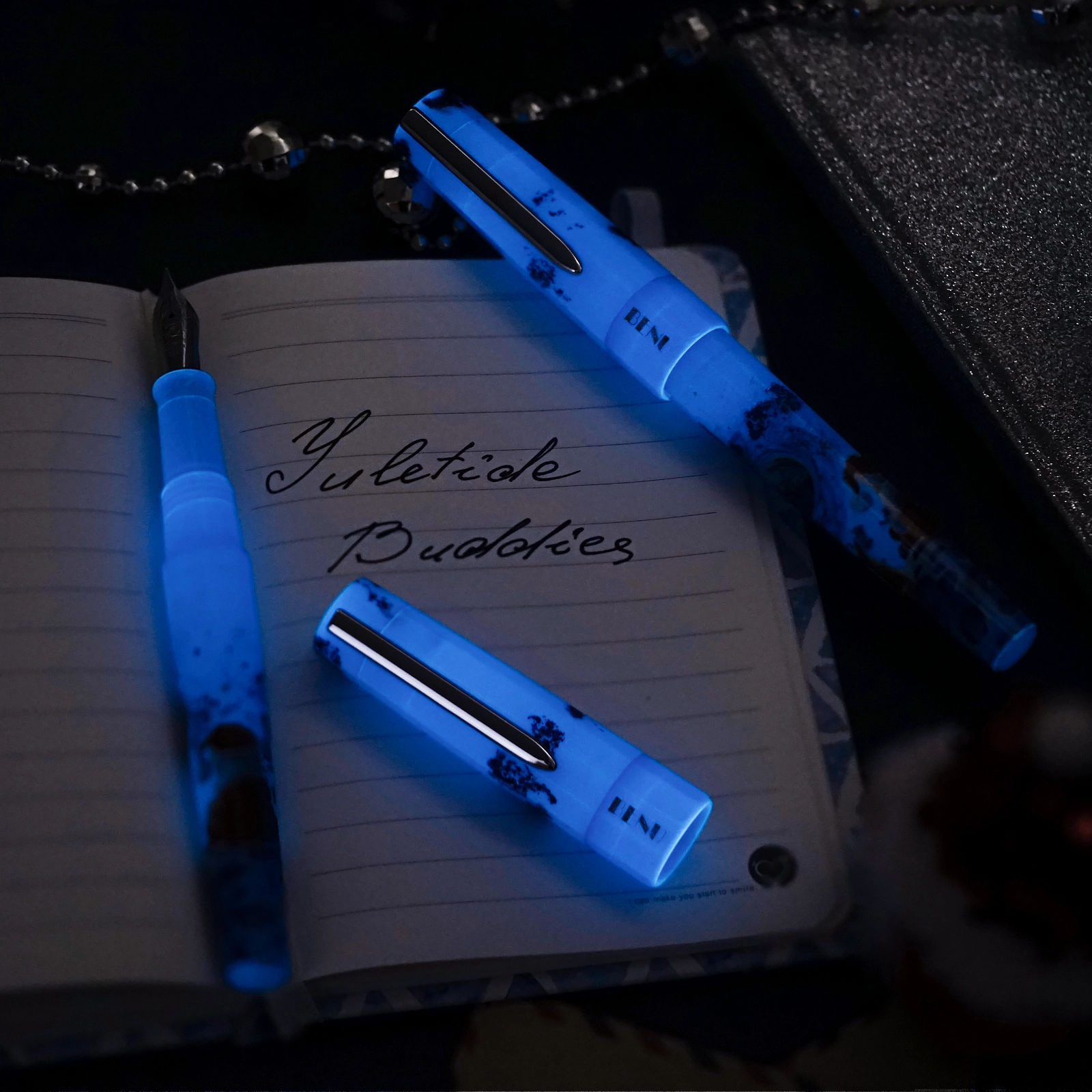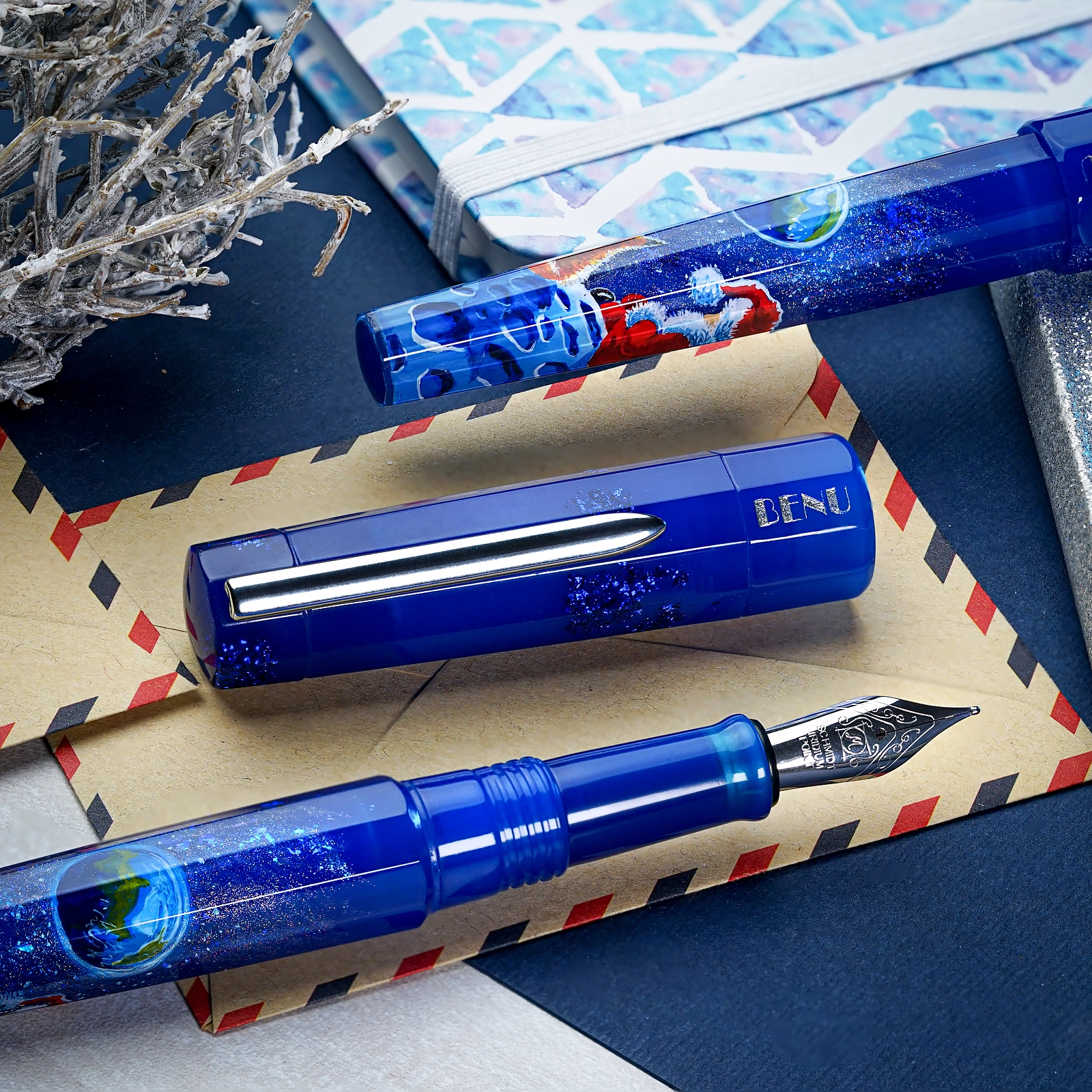 This magical number features intricate miniature artwork by the talented Ninel Gevorgyan, depicting her whimsical take on festive tales: Santa Claus and a sweet fox together on the moon, gazing at earth in the distance. Glowing beautifully in the dark with a soft blue light, could a pen get any more Christmassy?